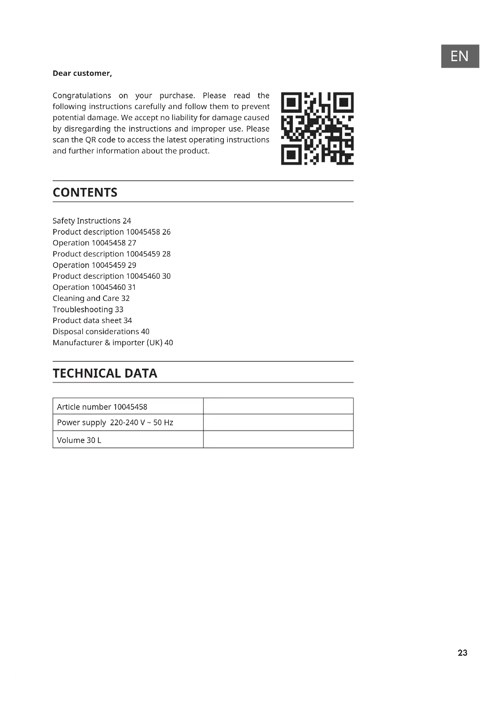 Dear customer, Congratulations on your purchase. Please read the following instructions carefully and follow them to prevent potential damage. We accept no liability for damage caused by disregarding the instructions and improper use. Please scan the QR code to access the latest operating instructions and further information about the product. CONTENTS Safety Instructions 24 Product description 10045458 26 Operation 10045458 27 Product description 10045459 28 Operation 10045459 29 Product description 10045460 30 Operation 10045460 31 Cleaning and Care 32 Troubleshooting 33 Product data sheet 34 Disposal considerations 40 Manufacturer & importer (UK) 40 TECHNICAL DATA Article number 10045458 Power supply 220-240 V ~ 50 Hz Volume 30 L24
