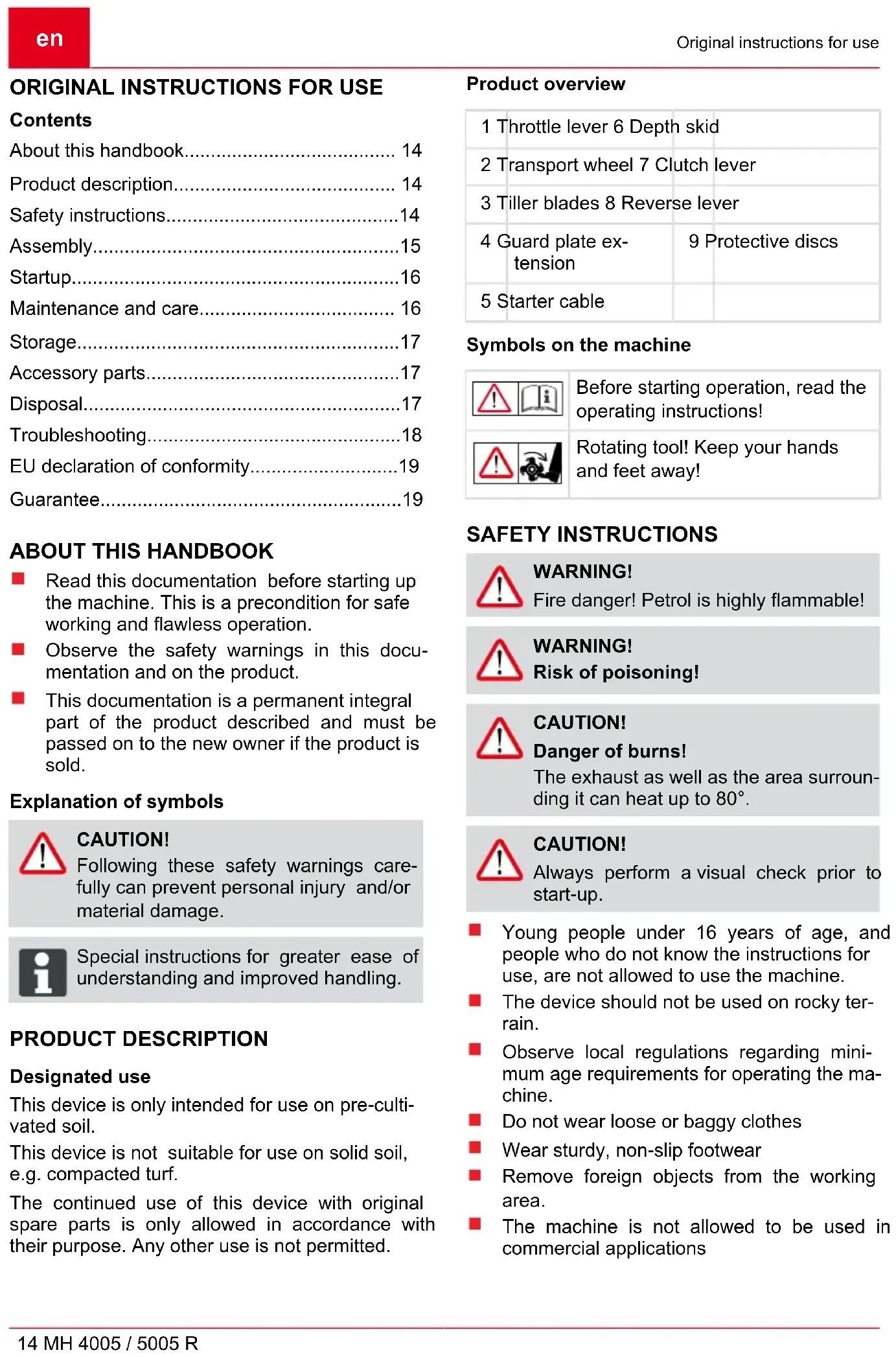 Read this documentation before starting up the machine. This is a precondition for safe working and flawless operation. Observe the safety warnings in this docu- mentation and on the product. This documentation is a permanent integral part of the product described and must be passed on to the new owner if the product is sold. Explanation of symbols CAUTION! Following these safety warnings care- fully can prevent personal injury and/or material damage. ADVICE Special instructions for greater ease of understanding and improved handling. PRODUCT DESCRIPTION Designated use This device is only intended for use on pre-culti- vated soil. This device is not suitable for use on solid soil, e.g. compacted turf. The continued use of this device with original spare parts is only allowed in accordance with their purpose. Any other use is not permitted. Product overview 1 Throttle lever 6 Depth skid 2 Transport wheel 7 Clutch lever 3 Tiller blades 8 Reverse lever 4 Guard plate ex- tension 9 Protective discs 5 Starter cable Symbols on the machine Before starting operation, read the operating instructions! Rotating tool! Keep your hands and feet away! SAFETY INSTRUCTIONS WARNING! Fire danger! Petrol is highly flammable! WARNING! Risk of poisoning! CAUTION! Danger of burns! The exhaust as well as the area surroun- ding it can heat up to 80°. CAUTION! Always perform a visual check prior to start-up. Young people under 16 years of age, and people who do not know the instructions for use, are not allowed to use the machine. The device should not be used on rocky ter- rain. Observe local regulations regarding mini- mum age requirements for operating the ma- chine. Do not wear loose or baggy clothes Wear sturdy, non-slip footwear Remove foreign objects from the working area. The machine is not allowed to be used in commercial applicationsSafety instructions 441442_a 15 The machine must not be operated if the ope- rator is under the influence of alcohol, drugs or medication. Observe local ordinances regarding opera- ting times. Work only when there is adequate daylight or artificial lighting. CAUTION! Always perform a visual check prior to start-up. The equipment should be used only if in good order and condition Note that the user is responsible for accidents and damage caused to other persons and/or their property Do not deactivate safety and protection de- vices Do not place your hands and feet close to any rotating parts. Never lift or carry the mower while the motor is running Always ensure stability when working. The user is responsible for accidents invol- ving other people and their property. Do not leave the appliance unsupervised. Keep the exhaust and motor clean Store petrol in designated containers only. Only refuel in open air. Replace a damaged petrol tank and/or tank cap. Only replace damaged or worn parts by ge- nuine spare parts. Subject to changes in design and configura- tion. No one should be standing in front of the de- vice and/or tiller blades when starting the mo- tor - the tiller blade drive must be turned off. When attaching and removing the transport wheel and/or when adjusting the depth skid, the motor must be turned off and the tiller bla- des must be upright. When moving the device using the attached transport wheel, turn off the motor and wait for the tiller blades to come to a standstill. The device may only be operated by main- taining the safety distance provided by the handlebar. Always operate parallel to the slope. Do not operate the device up or down the slope, as well as on slopes with a gradient of more than 10°. Do not open the tank cap or refuel with petrol while the motor is still running and while the machine is still hot. Use a funnel or a filler pipe when refuelling so that no fuel is spilled on the engine, the deck or the ground. Do not start the engine if petrol has over- flowed. The appliance may be cleaned, and any attempt at ignition may be made, only when the petrol vapours have dissipated. For safety reasons, never use the engine with worn or damaged parts. Such parts must al- ways be replaced, not repaired. Use OEM spare parts. Spare parts of inferior quality can damage the engine and endanger your safety Renew exhaust silencers if damaged. Do not change the engine governor settings. ASSEMBLY Assembly of depth skid (2) Insert the long side of the depth skid (2-1) into the end piece of the frame arm and lock it by turning the handle (2-2). Assembly of transport wheel (3) The transport wheel (3-1) is used to transport the cultivator. Push the transport wheel (3-1) onto the depth skid and secure it using the star screw (3-2). Remove the transport wheel during operation: Loosen the wing screw (3-2) and remove the transport wheel. Assembly of handlebar support (4) Attach the support (4-1) to the cultivator using the 4 screws (4-2) already positioned on the plate along with the washers (4-3) and nuts (4-4). Attach the cable feed-through (4-5) as shown in the figure (4).en Assembly 16 MH 4005 / 5005 R Fitting the handlebar (5) Fasten the 2 handlebars (5-1) to support by inserting the through screw (5-2), spacer (5-3), washers (5-4) and nut (5-5) in the up- per hole of the handlebar. Proceed in the same way for the lower hole (5-9), by fitting the other screw (5-2), spacer (5-3) and the washers h.4 (5-6) in the knob (5-7) and knob (5-8) complete with nut, in the sequence shown in the illustration (5). ADVICE To prevent fraying the Bowden cables, guide the Bowden cables between the through bolts (5-2) and spacers (5-3)! For more information, see Setting the handlebar. Assembly of throttle lever (6) Secure the throttle cable to the handlebars using a screw and hexagon nut. Assembly of control cable (7) Secure the control cable (7-1) to the right handlebar (7-3) using a screw (7-2). CAUTION! Guide the handlebar (7-3) between both control cables. STARTUP Only start up the machine, after assembly is fully completed. CAUTION! Fill with oil and petrol before initial sta