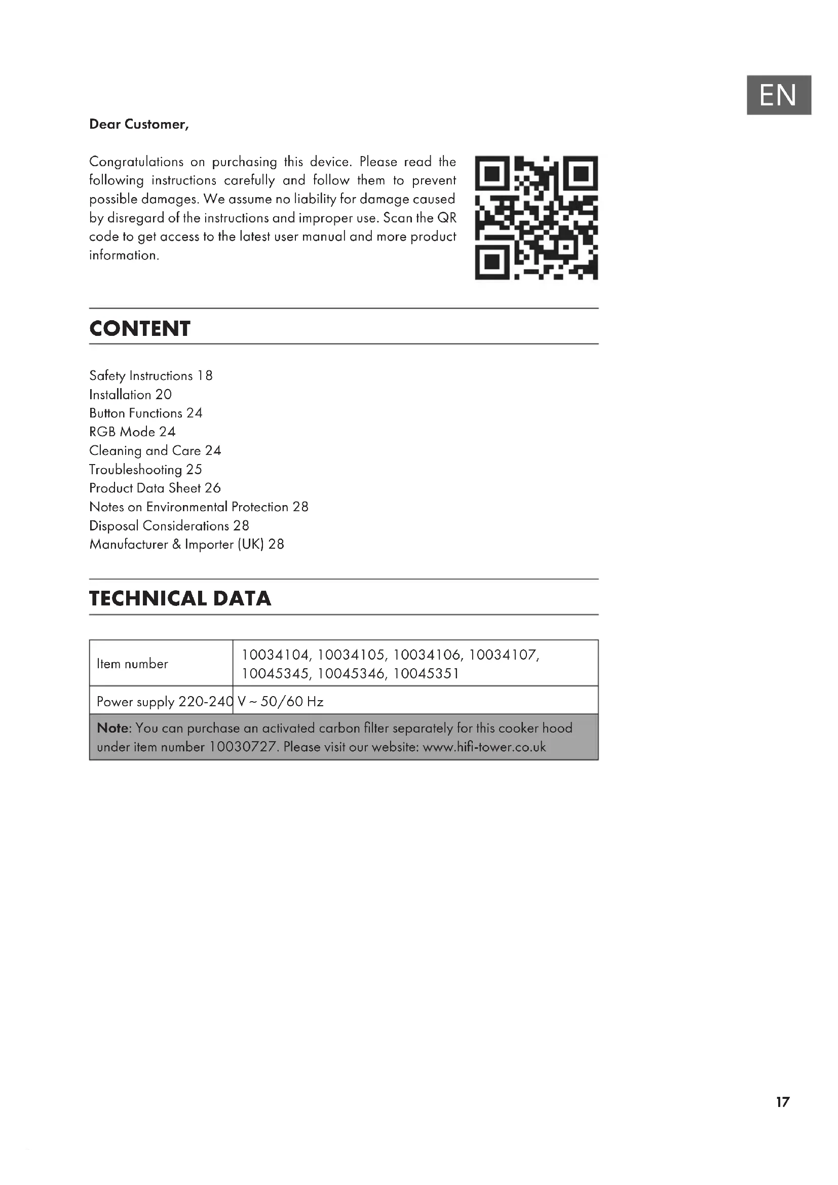 Dear Customer, Congratulations on purchasing this device. Please read the following instructions carefully and follow them to prevent possible damages. We assume no liability for damage caused by disregard of the instructions and improper use. Scan the QR code to get access to the latest user manual and more product information. CONTENT Safety Instructions18 Installation20 Button Functions24 RGB Mode24 Cleaning and Care24 Troubleshooting25 Product Data Sheet26 Notes on Environmental Protection28 Disposal Considerations28 Manufacturer & Importer (UK)28 TECHNICAL DATA Item number 10034104, 10034105, 10034106, 10034107, 10045345, 10045346, 10045351 Power supply 220-240 V ~ 50/60 Hz Note: You can purchase an activated carbon lter separately for this cooker hood under item number 10030727. Please visit our website: www.hi-tower.co.uk18