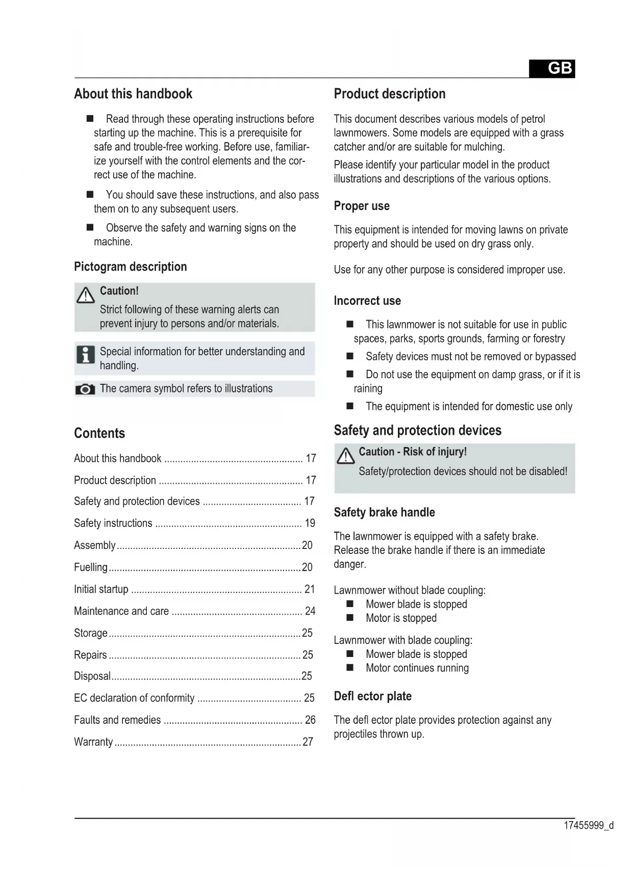 Special information for better understanding and handling. The camera symbol refers to illustrations The camera symbol refers to illustrations Product description This document describes various models of petrol lawnmowers. Some models are equipped with a grass catcher and/or are suitable for mulching. Please identify your particular model in the product illustrations and descriptions of the various options. Proper use This equipment is intended for moving lawns on private property and should be used on dry grass only. Use for any other purpose is considered improper use. Incorrect use This lawnmower is not suitable for use in public spaces, parks, sports grounds, farming or forestry Safety devices must not be removed or bypassed Do not use the equipment on damp grass, or if it is raining The equipment is intended for domestic use only Safety and protection devices Caution - Risk of injury! Safety/protection devices should not be disabled! Safety brake handle The lawnmower is equipped with a safety brake. Release the brake handle if there is an immediate danger. Lawnmower without blade coupling: Mower blade is stopped Motor is stopped Lawnmower with blade coupling: Mower blade is stopped Motor continues running Defl ector plate The defl ector plate provides protection against any projectiles thrown up.GB Translation of original user instructions Petrol lawnmower1 Starter cable 10 Vario transmission*2 Wheel drive* 11 Operating instructions3 Safety brake handle 12 Outlet shaft insert*4 Ergonomic height adjustment* 13 Cover fl ap*5 Fill level indicator* 14 Mulch kit*6Defl ector plate 15 Ignition switch for electric start*7 Grass catcher 16 Quick guide8 Cutting height adjustment 17 Remote throttle control*9 Blade coupling* * depending on versionSymbols on the deviceCaution!Be particularly careful when handling.Remove the spark plug connector before working on the cutting gear.Before initial startup read the instructions for use!STARTIgnition switch for electric start:Remove the ignition key before mainte-nance and repair work!Keep other people out of the danger area!Quick guideRelease the motor brake.Keep hands and feet away from the cutting gear!Quick guide Switch on the wheel drive.Keep away from the danger area.Quick guide Remote throttle control Start / Stop.