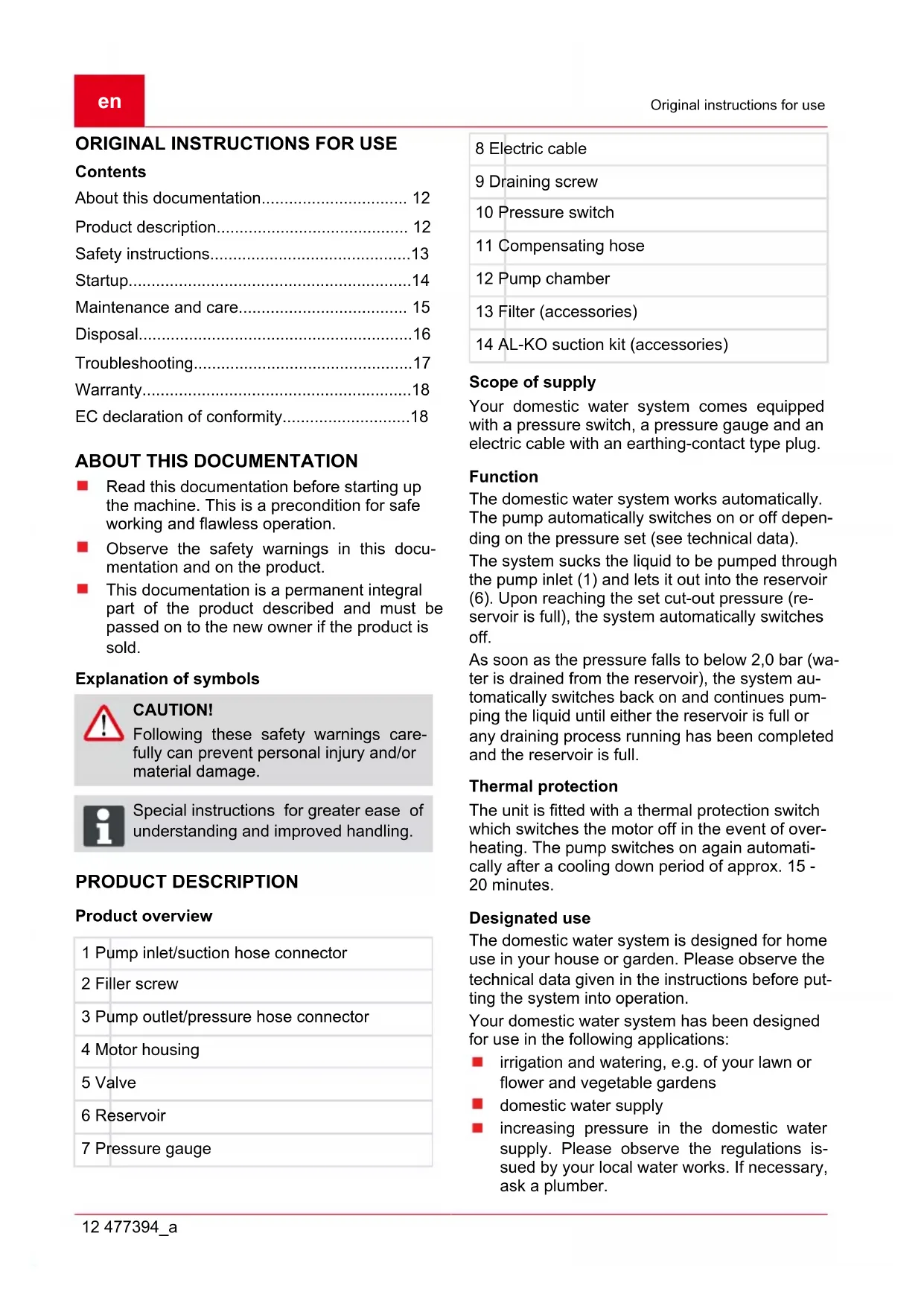 Read this documentation before starting up the machine. This is a precondition for safe working and flawless operation. Observe the safety warnings in this docu- mentation and on the product. This documentation is a permanent integral part of the product described and must be passed on to the new owner if the product is sold. Explanation of symbols CAUTION! Following these safety warnings care- fully can prevent personal injury and/or material damage. ADVICE Special instructions for greater ease of understanding and improved handling. PRODUCT DESCRIPTION Product overview 1 Pump inlet/suction hose connector 2 Filler screw 3 Pump outlet/pressure hose connector 4 Motor housing 5 Valve 6 Reservoir 7 Pressure gauge 8 Electric cable 9 Draining screw 10 Pressure switch 11 Compensating hose 12 Pump chamber 13 Filter (accessories) 14 AL-KO suction kit (accessories) Scope of supply Your domestic water system comes equipped with a pressure switch, a pressure gauge and an electric cable with an earthing-contact type plug. Function The domestic water system works automatically. The pump automatically switches on or off depen- ding on the pressure set (see technical data). The system sucks the liquid to be pumped through the pump inlet (1) and lets it out into the reservoir (6). Upon reaching the set cut-out pressure (re- servoir is full), the system automatically switches off. As soon as the pressure falls to below 2,0 bar (wa- ter is drained from the reservoir), the system au- tomatically switches back on and continues pum- ping the liquid until either the reservoir is full or any draining process running has been completed and the reservoir is full. Thermal protection The unit is fitted with a thermal protection switch which switches the motor off in the event of over- heating. The pump switches on again automati- cally after a cooling down period of approx. 15 - 20 minutes. Designated use The domestic water system is designed for home use in your house or garden. Please observe the technical data given in the instructions before put- ting the system into operation. Your domestic water system has been designed for use in the following applications: irrigation and watering, e.g. of your lawn or flower and vegetable gardens domestic water supply increasing pressure in the domestic water supply. Please observe the regulations is- sued by your local water works. If necessary, ask a plumber.Product description 477394_a 13 The system is designed to pump only the following liquids: clear water rain water Possible misuse Your domestic water system is not intended for permanent operation. The pump may not be used to pump the following liquids: drinking water salt water beverages or liquid foods corrosives or chemicals acids or combustible, explosive or gasfor- ming liquids liquids with a temperature above 35 °C sandy water or water containing abrasives SAFETY INSTRUCTIONS CAUTION! The domestic water system may only be connected to an electrical device which is compliant with DIN/VDE 0100, Parts 737, 738 and 702 (swimming pools). Make sure that fuse protection in the form of a 10 A automatic cut-out and a fault current guard circuit with a nominal fault current of 10/30 mA is installed. CAUTION! The supply voltage and current specified on the type plate must be identical with the voltage and current of your electrical system. CAUTION! If you need to connect your domestic wa- ter system to an extension cord, make sure that the cable is 3 x 1.5 mm2, which it corresponds to type H07RN-F and is compliant with DIN 57282/57245. The connector must be splash-proof. Cable drums must be completely unwound. CAUTION! Do not attempt to make any changes or modifications to the device by yourself. You may endanger your life or invalidate the warranty. CAUTION! Do not operate the system if it is dama- ged. Necessary repairs must be carried out in a qualified AL-KO service centre. CAUTION! Never use the electric cable to lift, carry or attach the system to another object. Do not pull on the cable when unplugging the system. CAUTION! Make sure that the system is unplugged before beginning any maintenance, re- pair or cleaning work. In the event of a malfunction, immediately unplug the sys- tem. Make sure that the plug does not get wet. CAUTION! The domestic water system may not be used for any other than its designated use. Before putting the system into ope- ration, make sure that the pump, reservoir, the electric ca- ble and the plug are not worn or da- maged.en Safety instructions 14 477394_a CAUTION! Risk of injury due to hot water! The water in the pump can heat up signi- ficantly, during longer periods of opera- tion (>10 min) against closed outlet side. This hazard can occur due to: side under compression closed water shortage in the suction line improper installation faulty pressure switch In this case: isolate the pump from the mains allow the pump and water to cool down check water level on inlet side check lines for tightness check installation check pressure switch only restart pump after rectifying the cause of the fault Children, or other people who are not familiar with the operating instructions, are not allo- wed to use the machine STARTUP CAUTION! When attaching the suction and pressure hoses, make sure that they do not exert a tension on the device. We recommend the use of flexible hoses at the pump inlet (1) and outlet (3). If you have any ques- tions, ask your retailer. CAUTION! When operating the system (automatic operation), take appropriate measures to ensure that damage due to flooding can- not occur if the system should malfunc- tion. This can be ensured, for instance, by installing an alarm system or a re- serve pump. ADVICE Before putting your domestic water sys- tem into operation, check the inlet pres- sure at the diaphragm which can be read out from the valve (5) on the reservoir. Make sure that the pressure is approx.