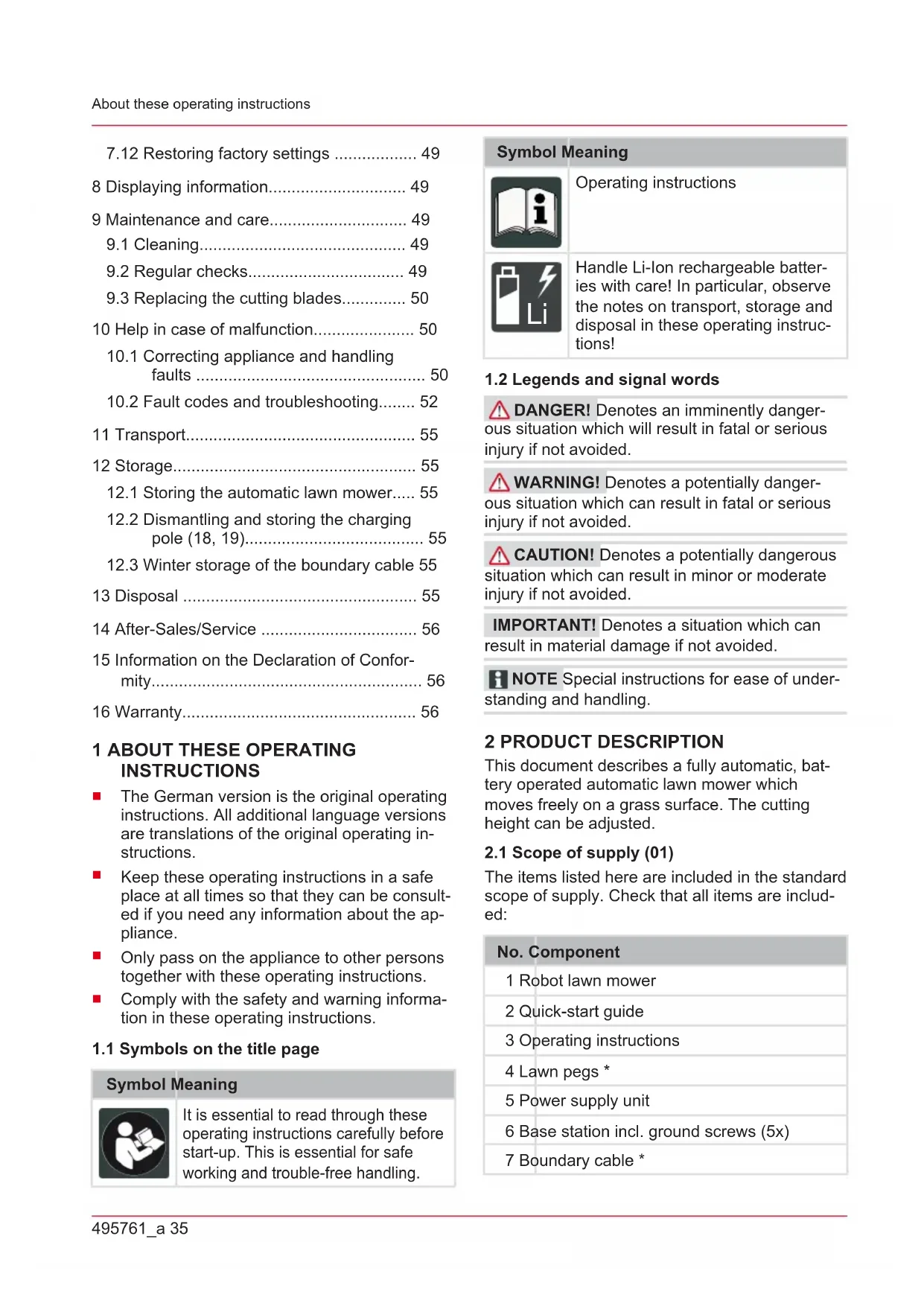 DANGER! Denotes an imminently danger- ous situation which will result in fatal or serious injury if not avoided. WARNING! Denotes a potentially danger- ous situation which can result in fatal or serious injury if not avoided. CAUTION! Denotes a potentially dangerous situation which can result in minor or moderate injury if not avoided. IMPORTANT! Denotes a situation which can result in material damage if not avoided. NOTE Special instructions for ease of under- standing and handling. 2 PRODUCT DESCRIPTION This document describes a fully automatic, bat- tery operated automatic lawn mower which moves freely on a grass surface. The cutting height can be adjusted.