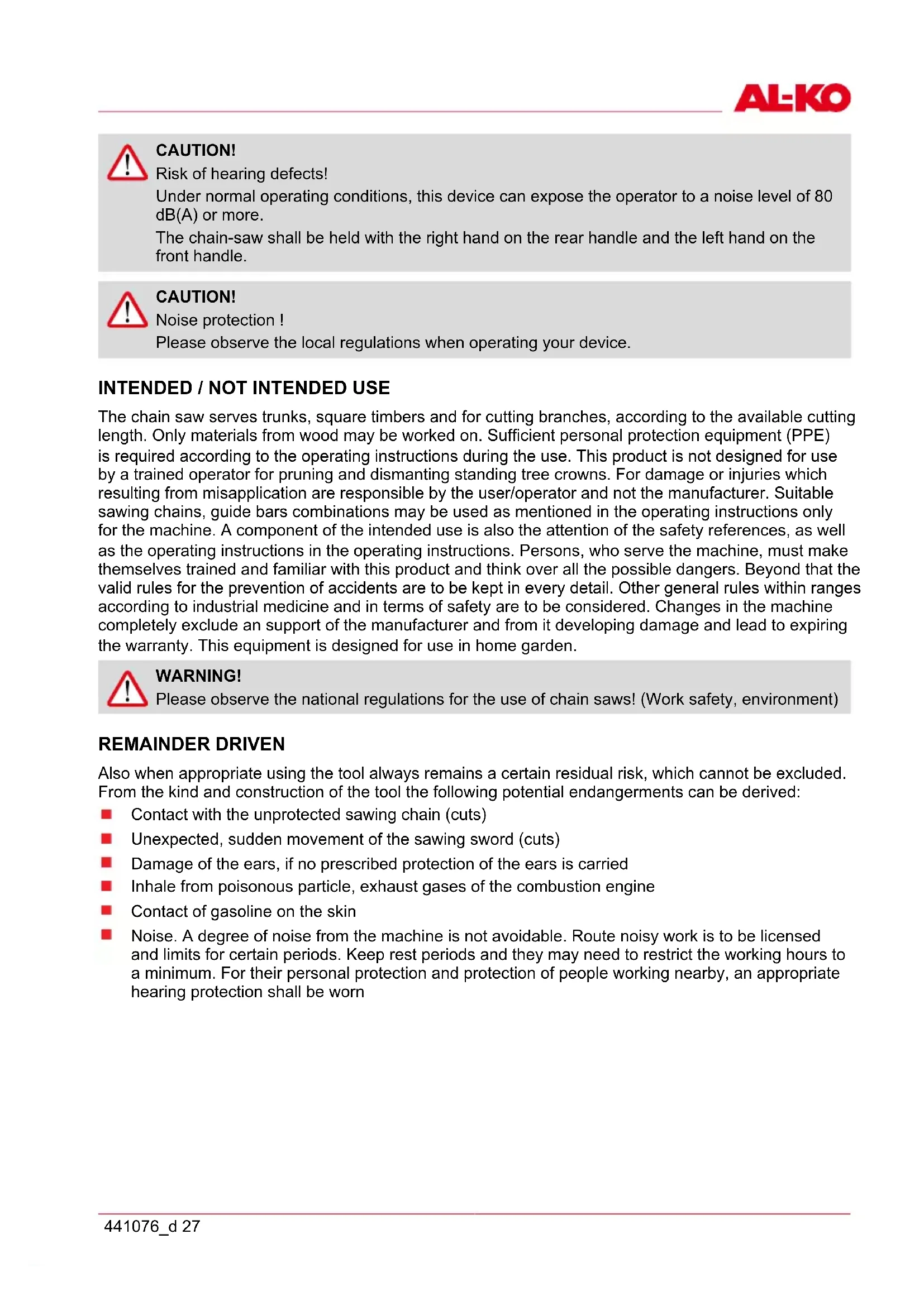 We hereby declare that this product, in the form in which it is marketed, meets the requirements of the harmonised EU guidelines, EU safety standards, and the product-specifi c standards. Produkt Manufacturer Executive Officer Chain Saw Serial number G4104105 AL-KO Geräte GmbH Ichenhauser Str. 14 D-89359 Kötz Andreas Hedrich Ichenhauser Str. 14 D-89359 Kötz Model EU directives Harmonised standards BKS 3835 BKS 4040 Sound power level EN ISO 3744 measured / guaranteed BKS 3835 - 108 / 112 dB(A) BKS 4040 - 110 / 113 dB(A) 2006/42/EC 2014/30/EU 2000/14/EC