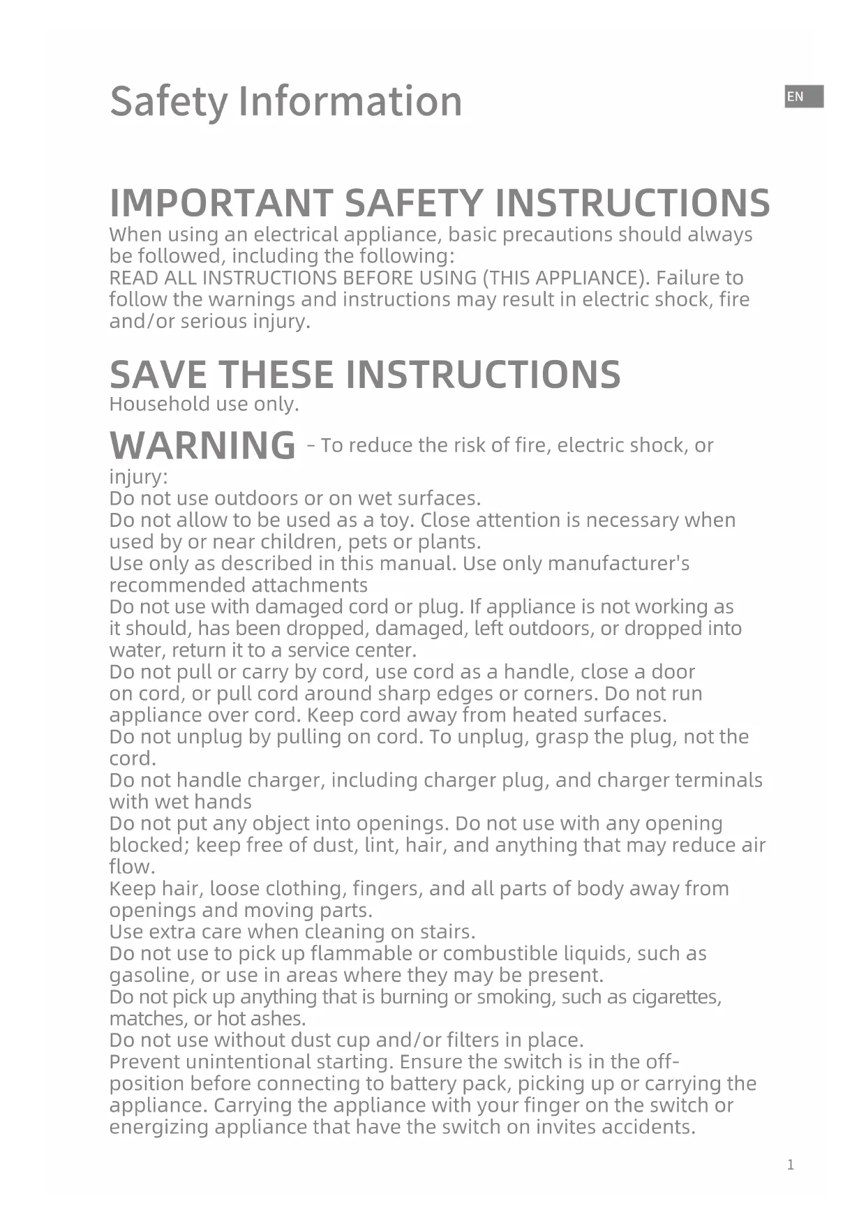 Household use only. WARNING – To reduce the risk of fire, electric shock, or injury: Do not use outdoors or on wet surfaces. Do not allow to be used as a toy. Close attention is necessary when used by or near children, pets or plants. Use only as described in this manual. Use only manufacturer's recommended attachments Do not use with damaged cord or plug. If appliance is not working as it should, has been dropped, damaged, left outdoors, or dropped into water, return it to a service center. Do not pull or carry by cord, use cord as a handle, close a door on cord, or pull cord around sharp edges or corners. Do not run appliance over cord. Keep cord away from heated surfaces. Do not unplug by pulling on cord. To unplug, grasp the plug, not the cord. Do not handle charger, including charger plug, and charger terminals with wet hands Do not put any object into openings. Do not use with any opening blocked; keep free of dust, lint, hair, and anything that may reduce air flow. Keep hair, loose clothing, fingers, and all parts of body away from openings and moving parts. Use extra care when cleaning on stairs. Do not use to pick up flammable or combustible liquids, such as gasoline, or use in areas where they may be present. Do not pick up anything that is burning or smoking, such as cigarettes, matches, or hot ashes. Do not use without dust cup and/or filters in place. Prevent unintentional starting. Ensure the switch is in the off- position before connecting to battery pack, picking up or carrying the appliance. Carrying the appliance with your finger on the switch or energizing appliance that have the switch on invites accidents. SafetyInformation2