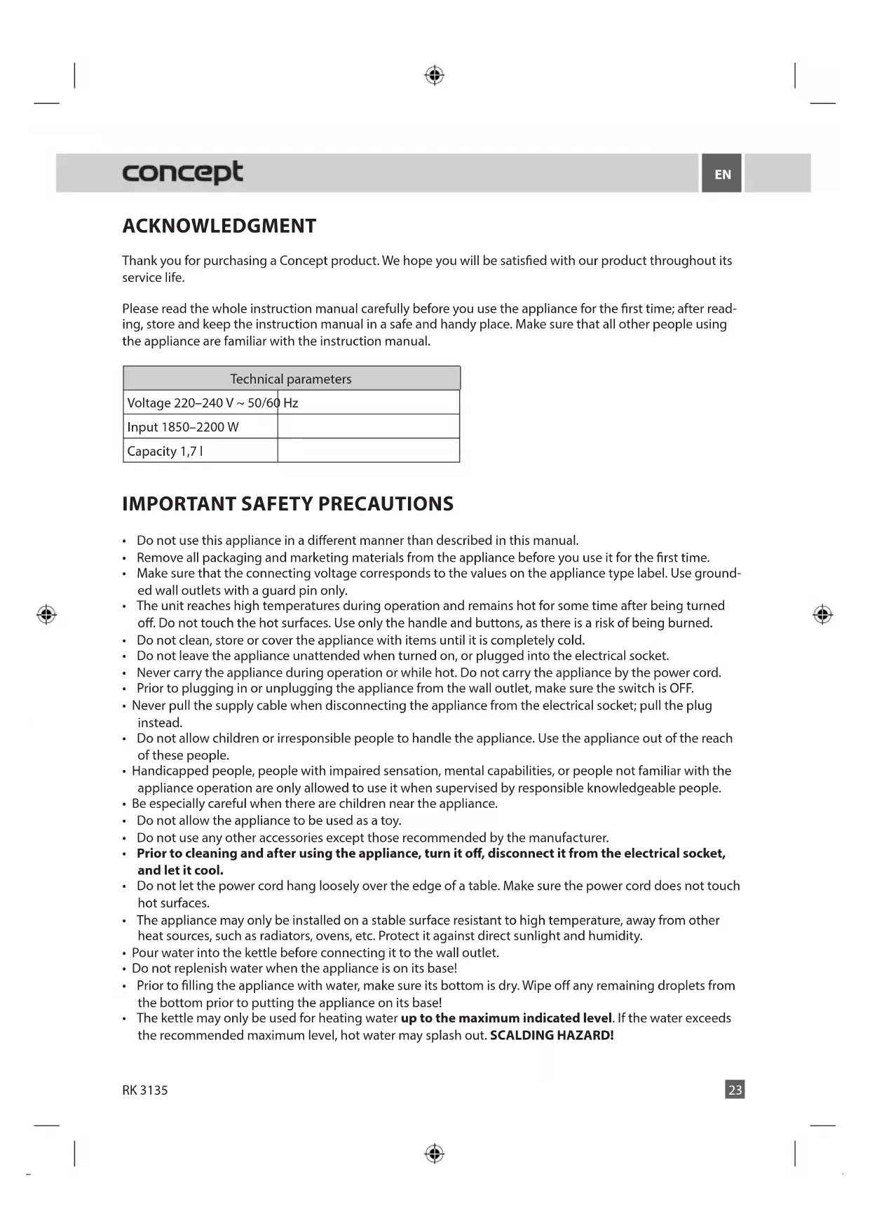ACKNOWLEDGMENT Thank you for purchasing a Concept product. We hope you will be satised with our product throughout its service life. Please read the whole instruction manual carefully before you use the appliance for the rst time; after read- ing, store and keep the instruction manual in a safe and handy place. Make sure that all other people using the appliance are familiar with the instruction manual. Technical parameters Voltage 220–240 V ~ 50/60 Hz Input 1850–2200 W Capacity 1,7 l