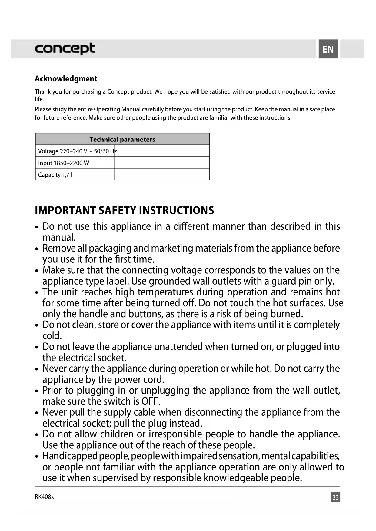 - Handicapped people, people with impaired sensation, mental capabilities, or people not familiar with the appliance operation are only allowed to use it when supervised by responsible knowledgeable people.34 RK408x