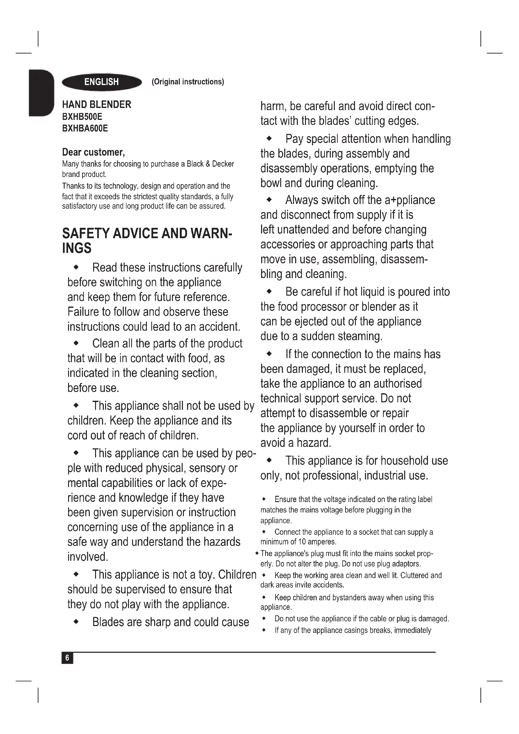 HAND BLENDER BXHB500E BXHBA600E Dear customer, Many thanks for choosing to purchase a Black & Decker brand product. Thanks to its technology, design and operation and the fact that it exceeds the strictest quality standards, a fully satisfactory use and long product life can be assured.