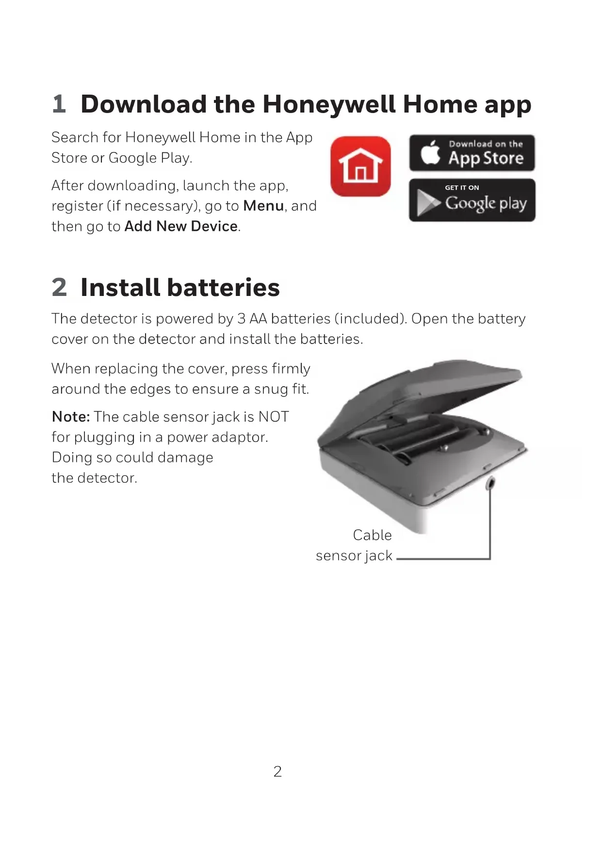 - Phone: 1-800-468-15022 1 Download the Honeywell Home app Search for Honeywell Home in the App Store or Google Play. After downloading, launch the app, register (if necessary), go to Menu, and then go to Add New Device. 2 Install batteries The detector is powered by 3 AA batteries (included). Open the battery cover on the detector and install the batteries. When replacing the cover, press firmly around the edges to ensure a snug fit. Note: The cable sensor jack is NOT for plugging in a power adaptor. Doing so could damage the detector. Cable sensor jack