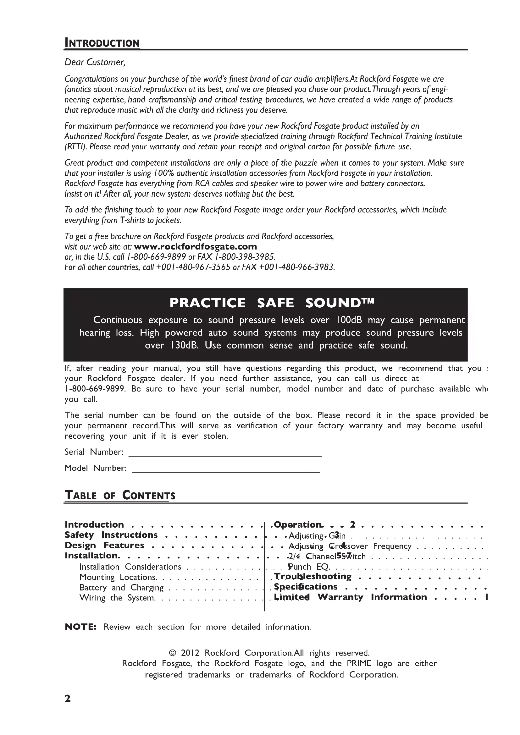 Dear Customer, Congratulations on your purchase of the world's finest brand of car audio amplifiers.At Rockford Fosgate we are fanatics about musical reproduction at its best, and we are pleased you chose our product.Through years of engi- neering expertise, hand craftsmanship and critical testing procedures, we have created a wide range of products that reproduce music with all the clarity and richness you deserve. For maximum performance we recommend you have your new Rockford Fosgate product installed by an Authorized Rockford Fosgate Dealer, as we provide specialized training through Rockford Technical Training Institute (RTTI). Please read your warranty and retain your receipt and original carton for possible future use. Great product and competent installations are only a piece of the puzzle when it comes to your system. Make sure that your installer is using 100% authentic installation accessories from Rockford Fosgate in your installation. Rockford Fosgate has everything from RCA cables and speaker wire to power wire and battery connectors. Insist on it! After all, your new system deserves nothing but the best. To add the finishing touch to your new Rockford Fosgate image order your Rockford accessories, which include everything from T-shirts to jackets. To get a free brochure on Rockford Fosgate products and Rockford accessories, visit our web site at: www.rockfordfosgate.com or, in the U.S. call 1-800-669-9899 or FAX 1-800-398-3985. For all other countries, call +001-480-967-3565 or FAX +001-480-966-3983.