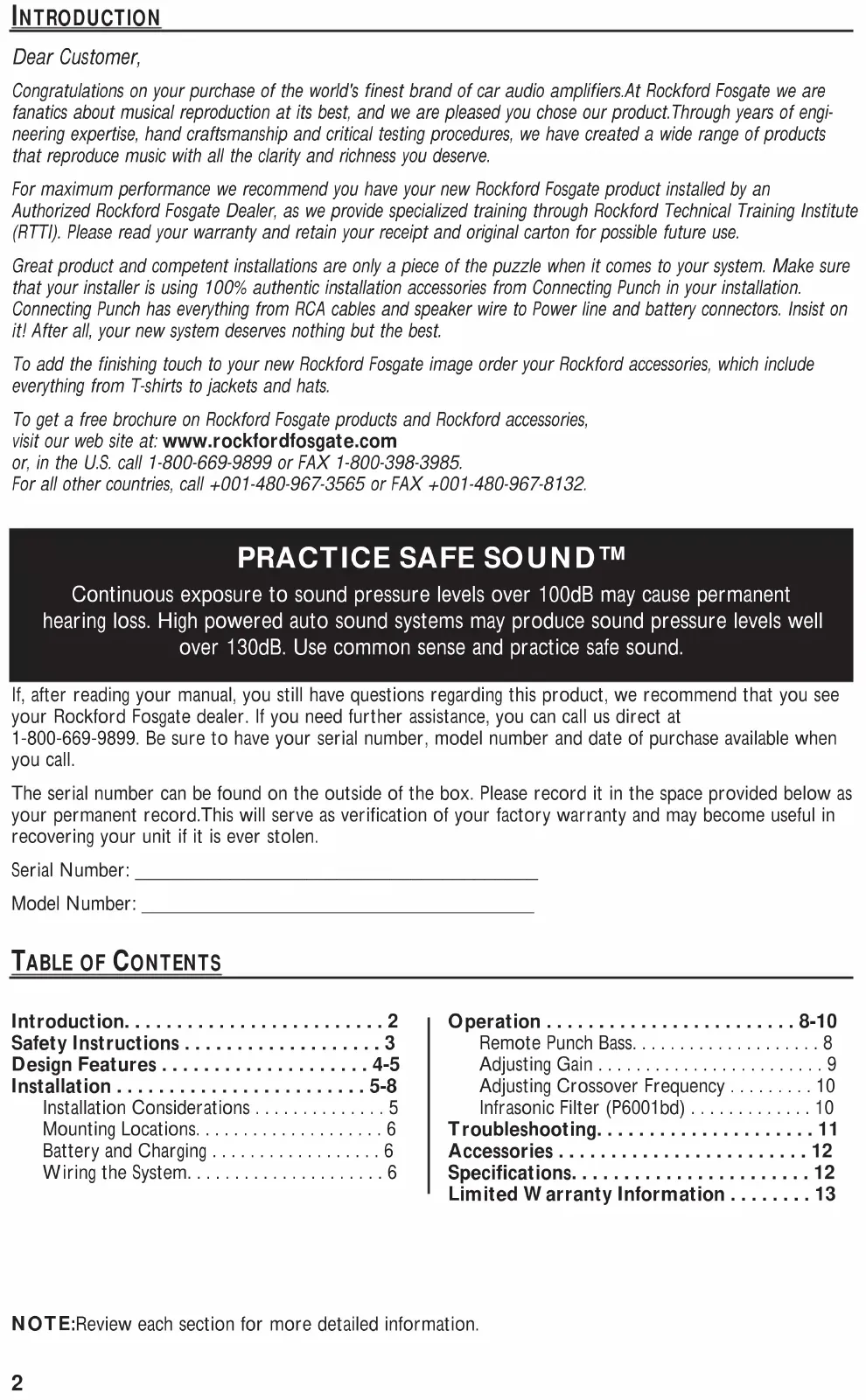 Dear Customer, Congratulations on your purchase of the world's finest brand of car audio amplifiers.At Rockford Fosgate we are fanatics about musical reproduction at its best, and we are pleased you chose our product.Through years of engi- neering expertise, hand craftsmanship and critical testing procedures, we have created a wide range of products that reproduce music with all the clarity and richness you deserve. For maximum performance we recommend you have your new Rockford Fosgate product installed by an Authorized Rockford Fosgate Dealer, as we provide specialized training through Rockford Technical Training Institute (RTTI). Please read your warranty and retain your receipt and original carton for possible future use. Great product and competent installations are only a piece of the puzzle when it comes to your system. Make sure that your installer is using 100% authentic installation accessories from Connecting Punch in your installation. Connecting Punch has everything from RCA cables and speaker wire to Power line and battery connectors. Insist on it! After all, your new system deserves nothing but the best. To add the finishing touch to your new Rockford Fosgate image order your Rockford accessories, which include everything from T-shirts to jackets and hats. To get a free brochure on Rockford Fosgate products and Rockford accessories, visit our web site at: www.rockfordfosgate.com or, in the U.S. call 1-800-669-9899 or FAX 1-800-398-3985. For all other countries, call +001-480-967-3565 or FAX +001-480-967-8132.
