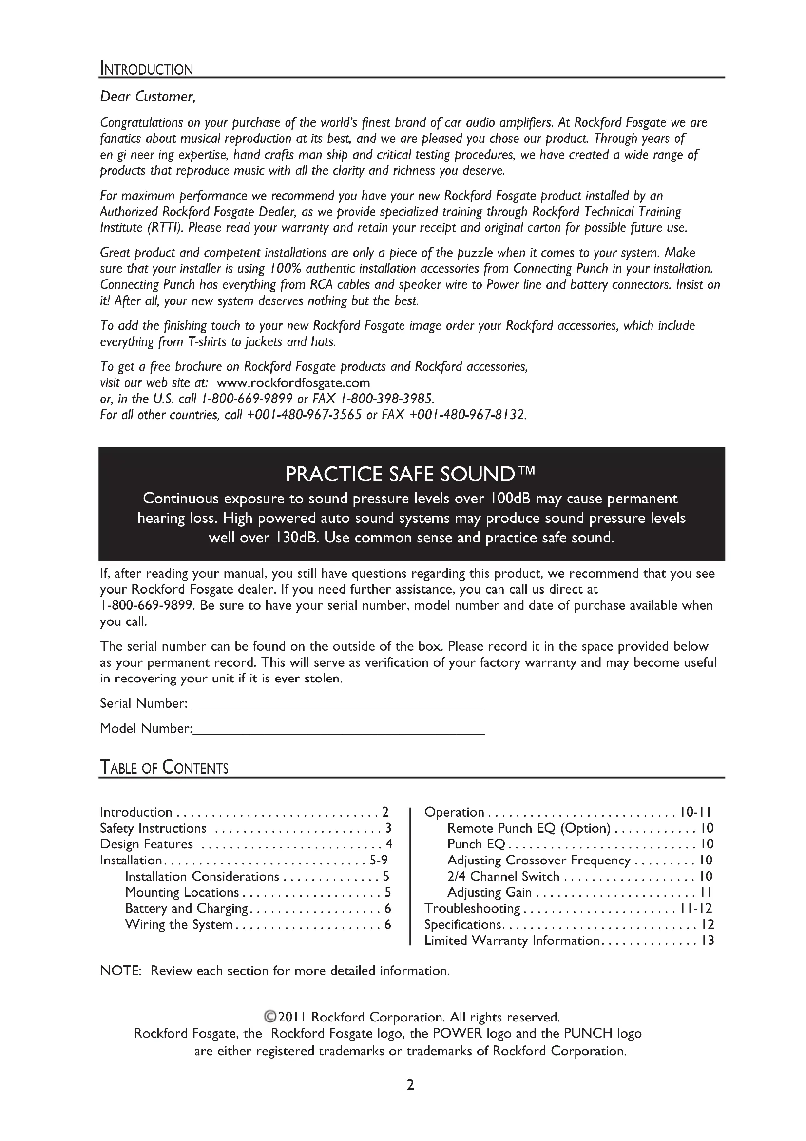 - NOTE: Review each section for more detailed information. If, after reading your manual, you still have questions regarding this product, we recommend that you see your Rockford Fosgate dealer. If you need further assistance, you can call us direct at 1-800-669-9899. Be sure to have your serial number, model number and date of purchase available when you call. The serial number can be found on the outside of the box. Please record it in the space provided below as your permanent record. This will serve as verification of your factory warranty and may become useful in recovering your unit if it is ever stolen. Serial Number: _________________________________________ Model Number: _________________________________________ Operation p. 10