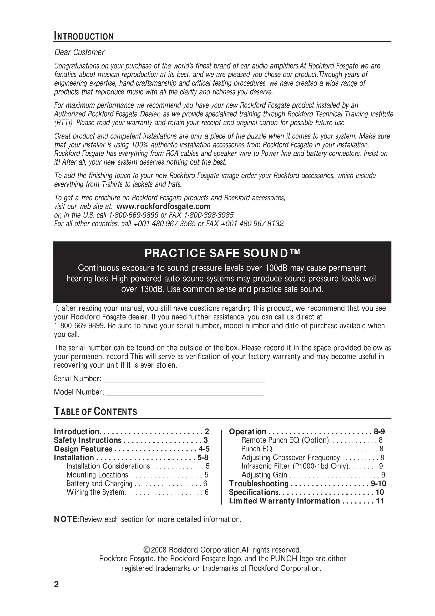 Dear Customer, Congratulations on your purchase of the world's finest brand of car audio amplifiers.At Rockford Fosgate we are fanatics about musical reproduction at its best, and we are pleased you chose our product.Through years of engineering expertise, hand craftsmanship and critical testing procedures, we have created a wide range of products that reproduce music with all the clarity and richness you deserve. For maximum performance we recommend you have your new Rockford Fosgate product installed by an Authorized Rockford Fosgate Dealer, as we provide specialized training through Rockford Technical Training Institute (RTTI). Please read your warranty and retain your receipt and original carton for possible future use. Great product and competent installations are only a piece of the puzzle when it comes to your system. Make sure that your installer is using 100% authentic installation accessories from Rockford Fosgate in your installation. Rockford Fosgate has everything from RCA cables and speaker wire to Power line and battery connectors. Insist on it! After all, your new system deserves nothing but the best. To add the finishing touch to your new Rockford Fosgate image order your Rockford accessories, which include everything from T-shirts to jackets and hats. To get a free brochure on Rockford Fosgate products and Rockford accessories, visit our web site at: www.rockfordfosgate.com or, in the U.S. call 1-800-669-9899 or FAX 1-800-398-3985. For all other countries, call +001-480-967-3565 or FAX +001-480-967-8132.