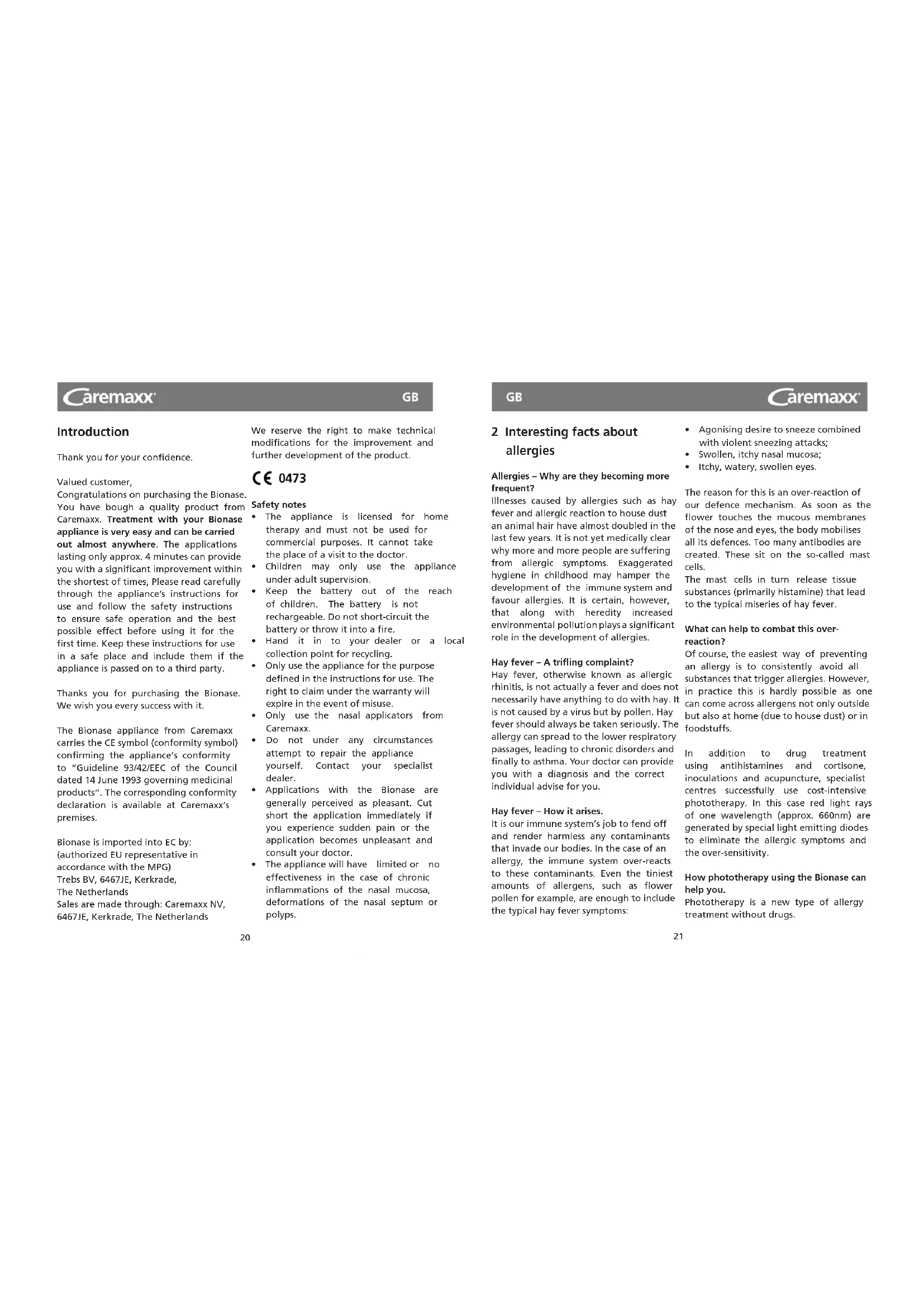 Introduction Thank you for your confidence. Valued customer, Congratulations on purchasing the Bionase. You have bough a quality product from Caremaxx. Treatment with your Bionase appliance is very easy and can be carried out almost anywhere. The applications lasting only approx. 4 minutes can provide you with a significant improvement within the shortest of times, Please read carefully through the appliance’s instructions for use and follow the safety instructions to ensure safe operation and the best possible effect before using it for the first time. Keep these instructions for use in a safe place and include them if the appliance is passed on to a third party. Thanks you for purchasing the Bionase. We wish you every success with it. The Bionase appliance from Caremaxx carries the CE symbol (conformity symbol) confirming the appliance’s conformity to “Guideline 93/42/EEC of the Council dated 14 June 1993 governing medicinal products”. The corresponding conformity declaration is available at Caremaxx’s premises. Bionase is imported into EC by: (authorized EU representative in accordance with the MPG) Trebs BV, 6467JE, Kerkrade, The Netherlands Sales are made through: Caremaxx NV, 6467JE, Kerkrade, The Netherlands We reserve the right to make technical modifications for the improvement and further development of the product. Safety notes
