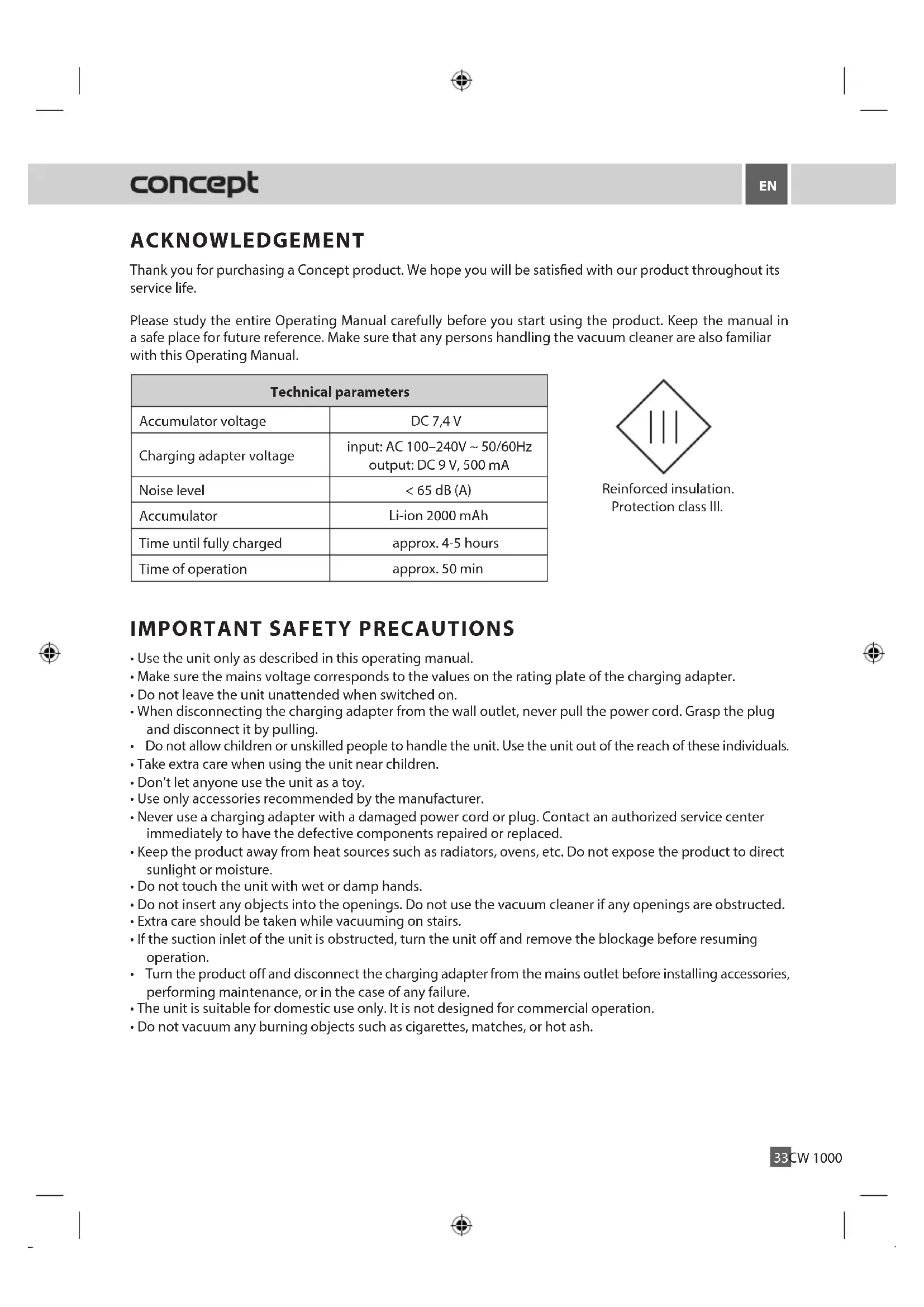Download the instructions for your Vacuum Cleaner in PDF format for free! Find your manual Perfect Clean CW1000 - Concept and take your electronic device back in hand. On this page are published all the documents necessary for the use of your device. Perfect Clean CW1000 by Concept.