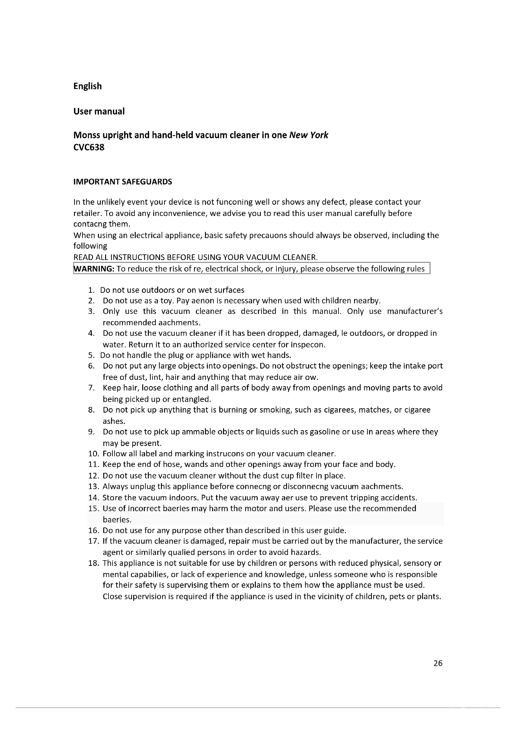 IMPORTANT SAFEGUARDS In the unlikely event your device is not functioning well or shows any defect, please contact your retailer. To avoid any inconvenience, we advise you to read this user manual carefully before contacting them. When using an electrical appliance, basic safety precautions should always be observed, including the following READ ALL INSTRUCTIONS BEFORE USING YOUR VACUUM CLEANER.