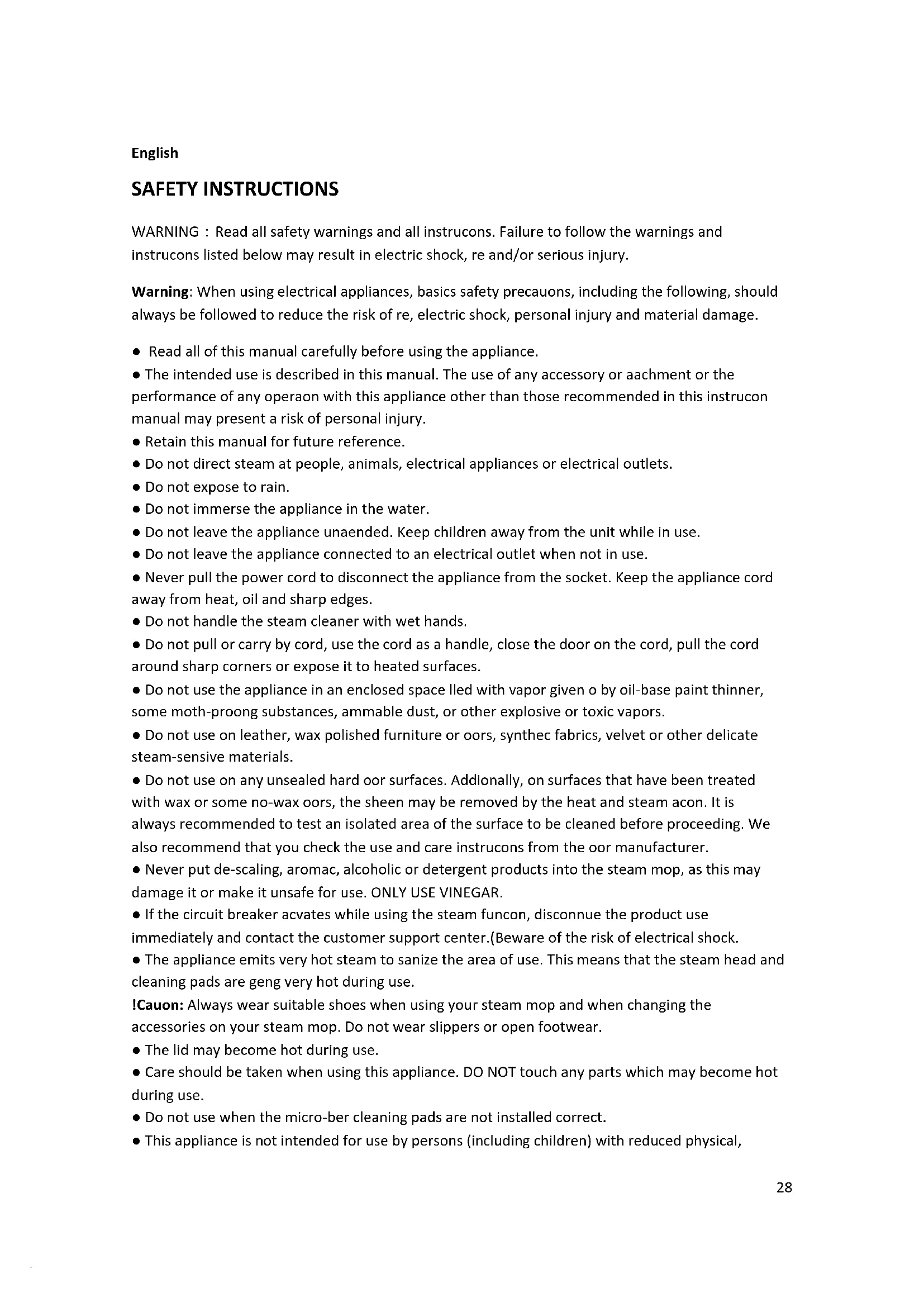 always be followed to reduce the risk of fire, electric shock, personal injury and material damage. ● Read all of this manual carefully before using the appliance. ● The intended use is described in this manual. The use of any accessory or attachment or the performance of any operation with this appliance other than those recommended in this instruction manual may present a risk of personal injury. ● Retain this manual for future reference. ● Do not direct steam at people, animals, electrical appliances or electrical outlets. ● Do not expose to rain. ● Do not immerse the appliance in the water. ● Do not leave the appliance unattended. Keep children away from the unit while in use. ● Do not leave the appliance connected to an electrical outlet when not in use. ● Never pull the power cord to disconnect the appliance from the socket. Keep the appliance cord away from heat, oil and sharp edges. ● Do not handle the steam cleaner with wet hands. ● Do not pull or carry by cord, use the cord as a handle, close the door on the cord, pull the cord around sharp corners or expose it to heated surfaces. ● Do not use the appliance in an enclosed space filled with vapor given off by oil-base paint thinner, some moth-proofing substances, flammable dust, or other explosive or toxic vapors. ● Do not use on leather, wax polished furniture or floors, synthetic fabrics, velvet or other delicate steam-sensitive materials. ● Do not use on any unsealed hard floor surfaces. Additionally, on surfaces that have been treated with wax or some no-wax floors, the sheen may be removed by the heat and steam action. It is always recommended to test an isolated area of the surface to be cleaned before proceeding. We also recommend that you check the use and care instructions from the floor manufacturer. ● Never put de-scaling, aromatic, alcoholic or detergent products into the steam mop, as this may damage it or make it unsafe for use. ONLY USE VINEGAR. ● If the circuit breaker activates while using the steam function, discontinue the product use immediately and contact the customer support center.(Beware of the risk of electrical shock. ● The appliance emits very hot steam to sanitize the area of use. This means that the steam head and cleaning pads are getting very hot during use. !Caution: Always wear suitable shoes when using your steam mop and when changing the accessories on your steam mop. Do not wear slippers or open footwear. ● The lid may become hot during use. ● Care should be taken when using this appliance. DO NOT touch any parts which may become hot during use. ● Do not use when the micro-fiber cleaning pads are not installed correct. ● This appliance is not intended for use by persons (including children) with reduced physical,29 sensory or mental capabilities, or lack of experience and knowledge, unless they have been given supervision or instruction concerning the use of the appliances by a person responsible for their safety. ● Children should be supervised to ensure that they do not play with the appliance. It is important for you to read and understand this manual. The information it contains relates to protecting YOUR SAFETY and PREVENTING PROBLEMS. The symbols below are used to help you recognize this information.
