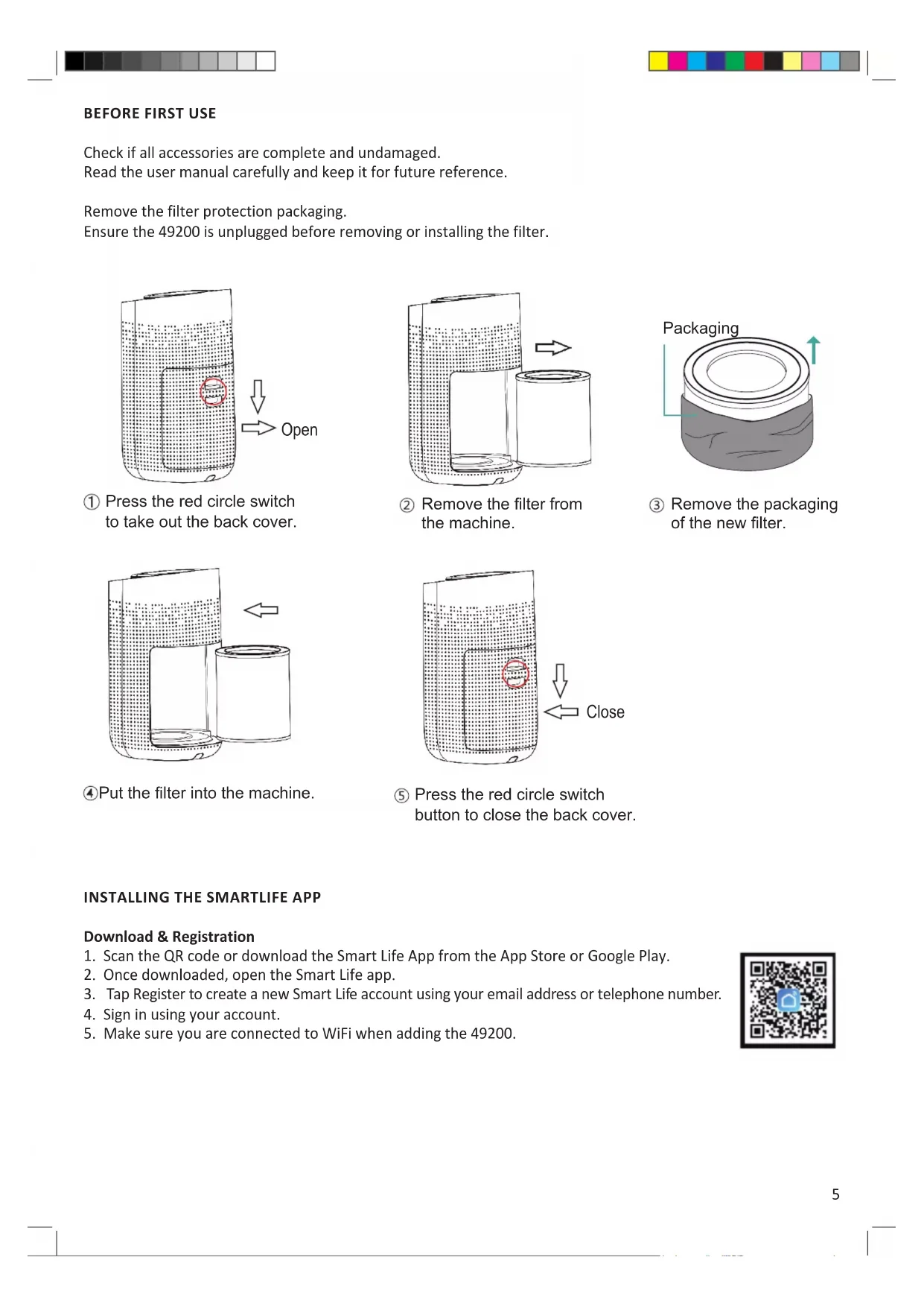 Check if all accessories are complete and undamaged. Read the user manual carefully and keep it for future reference. Remove the filter protection packaging. Ensure the 49200 is unplugged before removing or installing the filter. Press the red circle switch to take out the back cover. Open Remove the lter from the machine. Remove the packaging of the new lter. Packaging Put the lter into the machine. Press the red circle switch button to close the back cover. Close