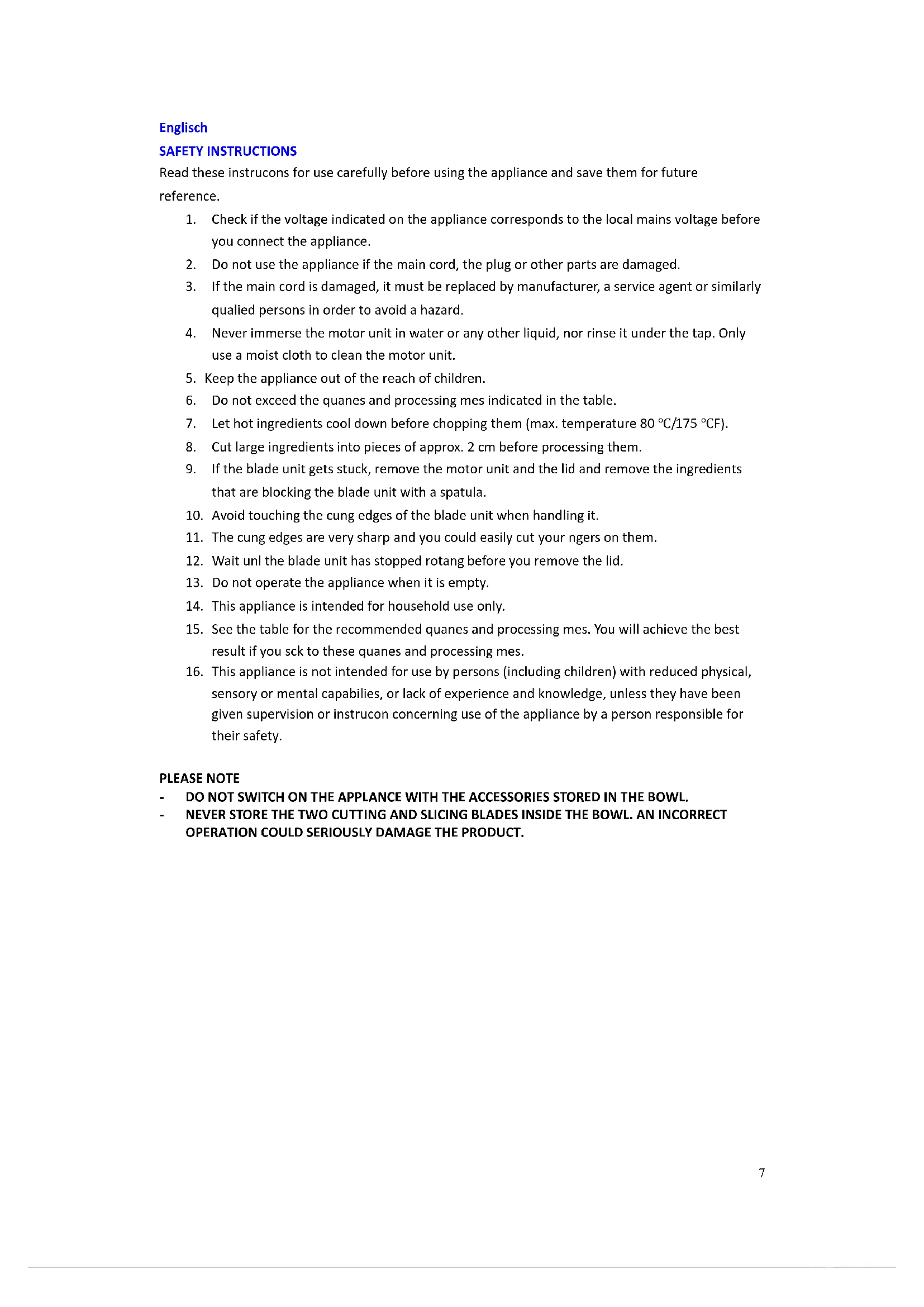 sensory or mental capabilities, or lack of experience and knowledge, unless they have been given supervision or instruction concerning use of the appliance by a person responsible for their safety. PLEASE NOTE - DO NOT SWITCH ON THE APPLANCE WITH THE ACCESSORIES STORED IN THE BOWL. - NEVER STORE THE TWO CUTTING AND SLICING BLADES INSIDE THE BOWL. AN INCORRECT