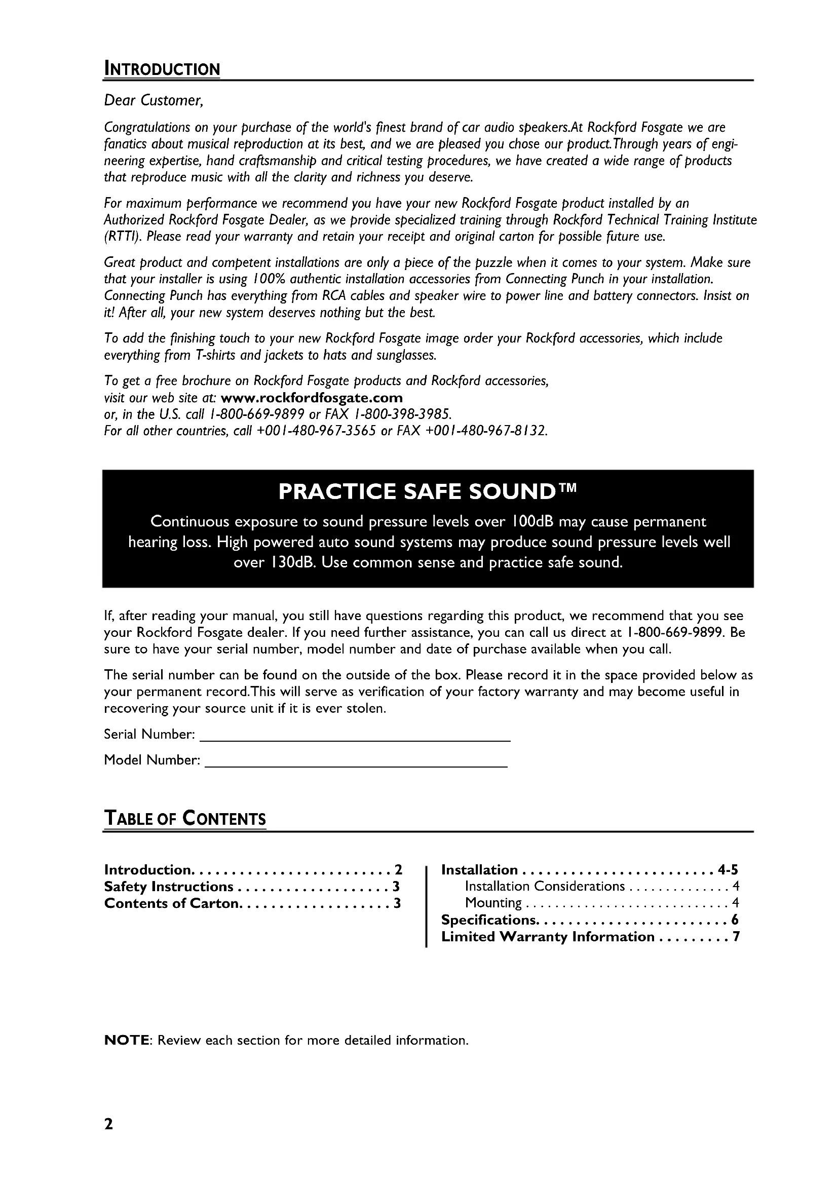 - Continuous exposure to sound pressure levels over 100dB may cause permanent hearing loss. High powered auto sound systems may produce sound pressure levels well over 130dB. Use common sense and practice safe sound. NOTE: Review each section for more detailed information. If, after reading your manual, you still have questions regarding this product, we recommend that you see your Rockford Fosgate dealer. If you need further assistance, you can call us direct at 1-800-669-9899. Be sure to have your serial number, model number and date of purchase available when you call. The serial number can be found on the outside of the box. Please record it in the space provided below as your permanent record.This will serve as verification of your factory warranty and may become useful in recovering your source unit if it is ever stolen. Serial Number: ______________________________________ Model Number: _____________________________________ Introduction p. 2