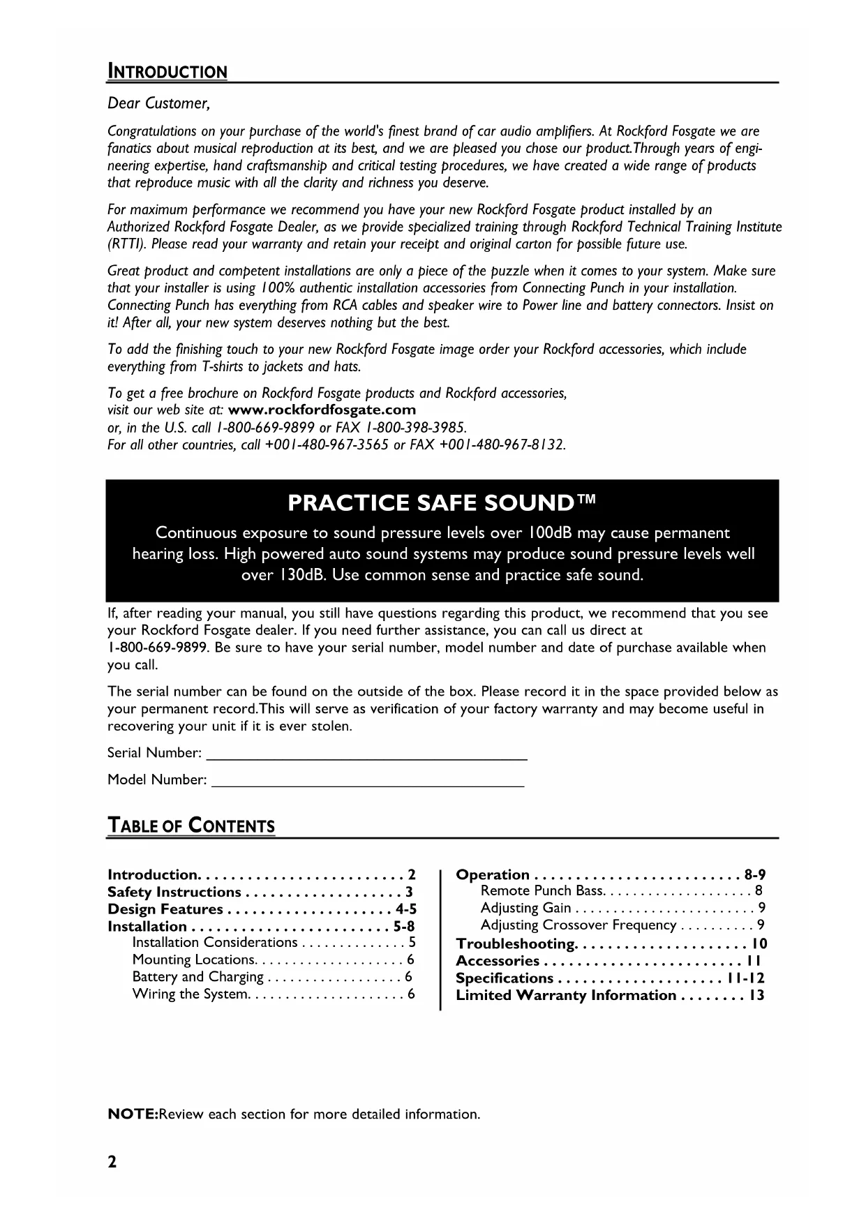 Dear Customer, Congratulations on your purchase of the world's finest brand of car audio amplifiers. At Rockford Fosgate we are fanatics about musical reproduction at its best, and we are pleased you chose our product.Through years of engi- neering expertise, hand craftsmanship and critical testing procedures, we have created a wide range of products that reproduce music with all the clarity and richness you deserve. For maximum performance we recommend you have your new Rockford Fosgate product installed by an Authorized Rockford Fosgate Dealer, as we provide specialized training through Rockford Technical Training Institute (RTTI). Please read your warranty and retain your receipt and original carton for possible future use. Great product and competent installations are only a piece of the puzzle when it comes to your system. Make sure that your installer is using 100% authentic installation accessories from Connecting Punch in your installation. Connecting Punch has everything from RCA cables and speaker wire to Power line and battery connectors. Insist on it! After all, your new system deserves nothing but the best. To add the finishing touch to your new Rockford Fosgate image order your Rockford accessories, which include everything from T-shirts to jackets and hats. To get a free brochure on Rockford Fosgate products and Rockford accessories, visit our web site at: www.rockfordfosgate.com or, in the U.S. call 1-800-669-9899 or FAX 1-800-398-3985. For all other countries, call +001-480-967-3565 or FAX +001-480-967-8132.