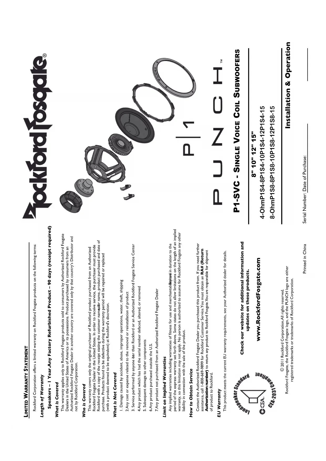 Printed in China Installation & Operation P1-SVC - SINGLE VOICE COIL SUBWOOFERS 8" 10" 12" 15" 4-Ohm P1S4-8 P1S4-10 P1S4-12 P1S4-15 8-Ohm P1S8-8 P1S8-10 P1S8-12 P1S8-15 Serial Number: Date of Purchase: Rockford Corporation offers a limited warranty on Rockford Fosgate products on the following terms: Length of Warranty Speakers – 1 Year.Any Factory Refurbished Product – 90 days (receipt required) What is Covered This warranty applies only to Rockford Fosgate products sold to consumers by Authorized Rockford FosgateDealers in the United States of America or its possessions. Product purchased by consumers from anAuthorized Rockford Fosgate Dealer in another country are covered only by that country’s Distributor andnot by Rockford Corporation. Who is Covered This warranty covers only the original purchaser of Rockford product purchased from an AuthorizedRockford Fosgate Dealer in the United States. In order to receive service, the purchaser must provideRockford with a copy of the receipt stating the customer name, dealer name, product purchased and date ofpurchase. Products found to be defective during the warranty period will be repaired or replaced (with a product deemed to be equivalent) at Rockford's discretion. What is Not Covered 1. Damage caused by accident, abuse, improper operations, water, theft, shipping2.Any cost or expense related to the removal or reinstallation of product3. Service performed by anyone other than Rockford or an Authorized Rockford Fosgate Service Center4.Any product which has had the serial number defaced, altered, or removed5. Subsequent damage to other components6.Any product purchased outside the U.S.7.Any product not purchased from an Authorized Rockford Fosgate Dealer Limit on Implied Warranties Any implied warranties including warranties of fitness for use and merchantability are limited in duration to theperiod of the express warranty set forth above. Some states do not allow limitations on the length of an impliedwarranty, so this limitation may not apply. No person is authorized to assume for Rockford Fosgate any other liability in connection with the sale of the product. How to Obtain Service Contact the Authorized Rockford Fosgate Dealer you purchased this product from. If you need further assistance, call 1-800-669-9899 for Rockford Customer Service.You must obtain an RA# (Return Authorization number) to return any product to Rockford Fosgate.You are responsible for shipment of product to Rockford. EU Warranty This product meets the current EU warranty requirements, see your Authorized dealer for details.2011 Rockford Corporation.All rights reserved.Rockford Fosgate, the Rockford Fosgate logo, and the PUNCH logo are either registered trademarks or trademarks of Rockford Corporation.