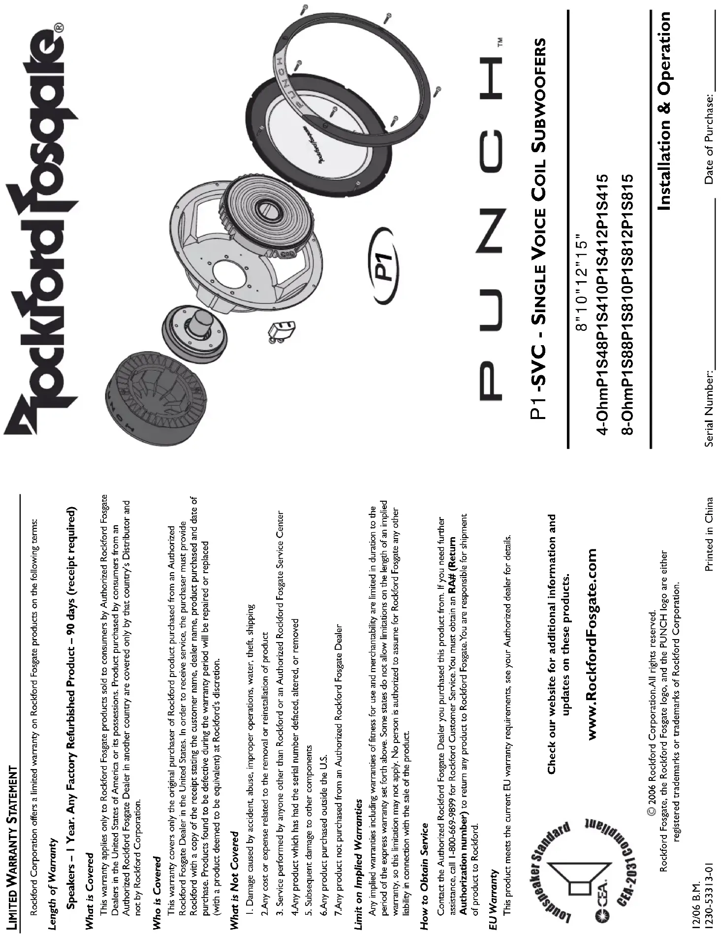 8" 10" 12" 15" 4-Ohm P1S48 P1S410 P1S412 P1S415 8-Ohm P1S88 P1S810 P1S812 P1S815 Serial Number: Date of Purchase: Rockford Corporation offers a limited warranty on Rockford Fosgate products on the following terms: Length of Warranty Speakers – 1 Year. Any Factory Refurbished Product – 90 days (receipt required) What is Covered This warranty applies only to Rockford Fosgate products sold to consumers by Authorized Rockford FosgateDealers in the United States of America or its possessions. Product purchased by consumers from anAuthorized Rockford Fosgate Dealer in another country are covered only by that country’s Distributor andnot by Rockford Corporation. Who is Covered This warranty covers only the original purchaser of Rockford product purchased from an AuthorizedRockford Fosgate Dealer in the United States. In order to receive service, the purchaser must provideRockford with a copy of the receipt stating the customer name, dealer name, product purchased and date ofpurchase. Products found to be defective during the warranty period will be repaired or replaced (with a product deemed to be equivalent) at Rockford's discretion. What is Not Covered 1. Damage caused by accident, abuse, improper operations, water, theft, shipping2.Any cost or expense related to the removal or reinstallation of product3. Service performed by anyone other than Rockford or an Authorized Rockford Fosgate Service Center4.Any product which has had the serial number defaced, altered, or removed5. Subsequent damage to other components6.Any product purchased outside the U.S.7.Any product not purchased from an Authorized Rockford Fosgate Dealer Limit on Implied Warranties Any implied warranties including warranties of fitness for use and merchantability are limited in duration to theperiod of the express warranty set forth above. Some states do not allow limitations on the length of an impliedwarranty, so this limitation may not apply. No person is authorized to assume for Rockford Fosgate any other liability in connection with the sale of the product. How to Obtain Service Contact the Authorized Rockford Fosgate Dealer you purchased this product from. If you need further assistance, call 1-800-669-9899 for Rockford Customer Service.You must obtain an RA# (Return Authorization number) to return any product to Rockford Fosgate.You are responsible for shipment of product to Rockford. EU Warranty This product meets the current EU warranty requirements, see your Authorized dealer for details.2006 Rockford Corporation.All rights reserved.Rockford Fosgate, the Rockford Fosgate logo, and the PUNCH logo are either registered trademarks or trademarks of Rockford Corporation.