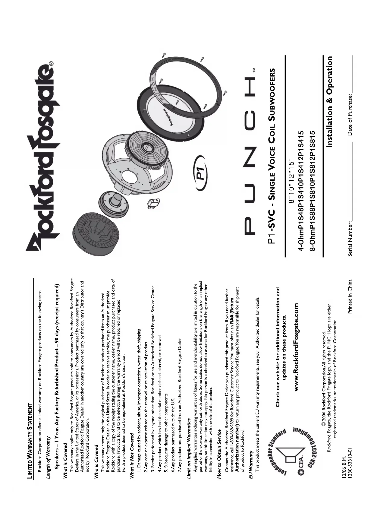 8" 10" 12" 15" 4-Ohm P1S48 P1S410 P1S412 P1S415 8-Ohm P1S88 P1S810 P1S812 P1S815 Serial Number: Date of Purchase: Rockford Corporation offers a limited warranty on Rockford Fosgate products on the following terms: Length of Warranty Speakers – 1 Year. Any Factory Refurbished Product – 90 days (receipt required) What is Covered This warranty applies only to Rockford Fosgate products sold to consumers by Authorized Rockford FosgateDealers in the United States of America or its possessions. Product purchased by consumers from anAuthorized Rockford Fosgate Dealer in another country are covered only by that country’s Distributor andnot by Rockford Corporation. Who is Covered This warranty covers only the original purchaser of Rockford product purchased from an AuthorizedRockford Fosgate Dealer in the United States. In order to receive service, the purchaser must provideRockford with a copy of the receipt stating the customer name, dealer name, product purchased and date ofpurchase. Products found to be defective during the warranty period will be repaired or replaced (with a product deemed to be equivalent) at Rockford's discretion. What is Not Covered 1. Damage caused by accident, abuse, improper operations, water, theft, shipping2.Any cost or expense related to the removal or reinstallation of product3. Service performed by anyone other than Rockford or an Authorized Rockford Fosgate Service Center4.Any product which has had the serial number defaced, altered, or removed5. Subsequent damage to other components6.Any product purchased outside the U.S.7.Any product not purchased from an Authorized Rockford Fosgate Dealer Limit on Implied Warranties Any implied warranties including warranties of fitness for use and merchantability are limited in duration to theperiod of the express warranty set forth above. Some states do not allow limitations on the length of an impliedwarranty, so this limitation may not apply. No person is authorized to assume for Rockford Fosgate any other liability in connection with the sale of the product. How to Obtain Service Contact the Authorized Rockford Fosgate Dealer you purchased this product from. If you need further assistance, call 1-800-669-9899 for Rockford Customer Service.You must obtain an RA# (Return Authorization number) to return any product to Rockford Fosgate.You are responsible for shipment of product to Rockford. EU Warranty This product meets the current EU warranty requirements, see your Authorized dealer for details.2006 Rockford Corporation.All rights reserved.Rockford Fosgate, the Rockford Fosgate logo, and the PUNCH logo are either registered trademarks or trademarks of Rockford Corporation.