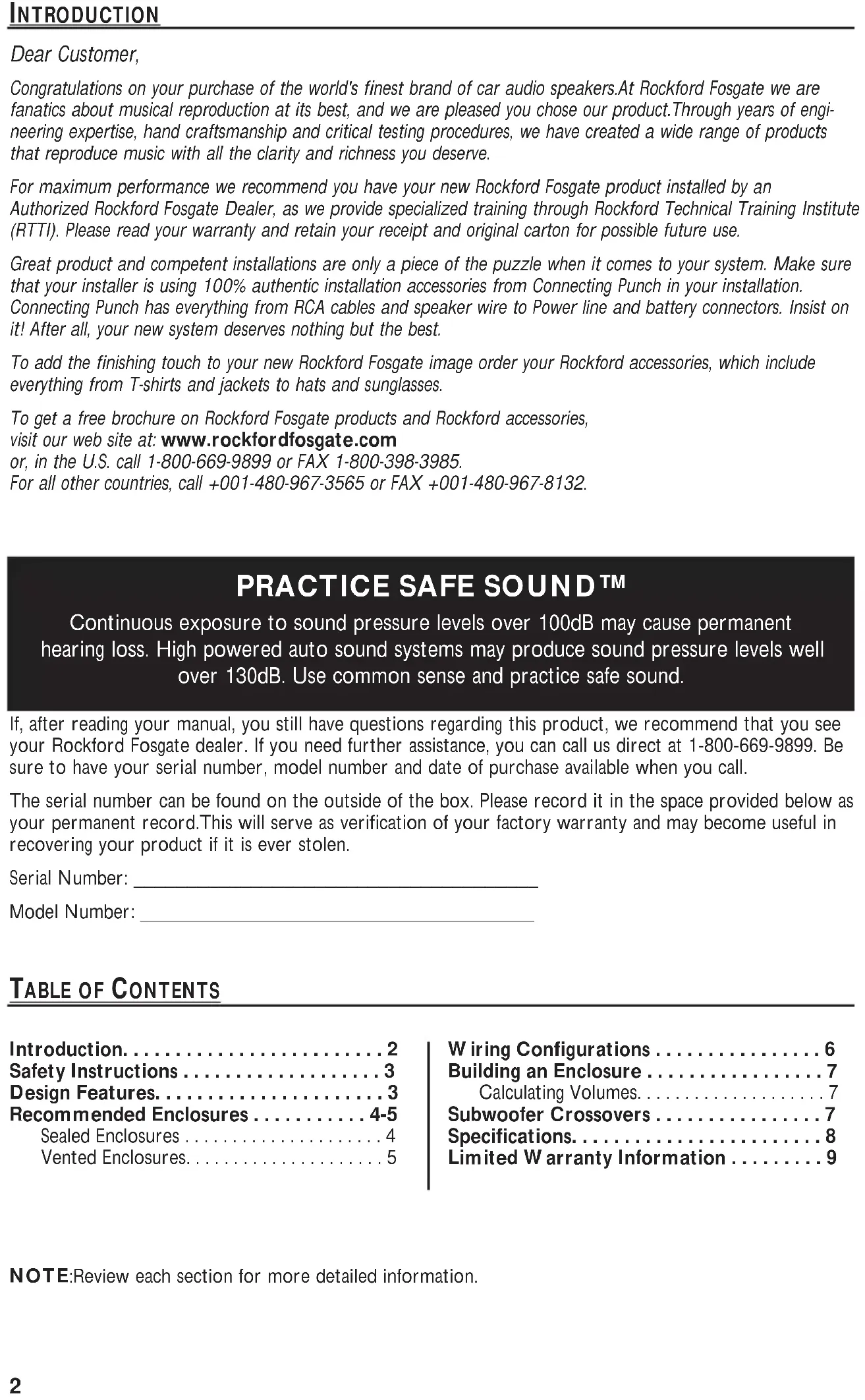 Dear Customer, Congratulations on your purchase of the world's finest brand of car audio speakers.At Rockford Fosgate we are fanatics about musical reproduction at its best, and we are pleased you chose our product.Through years of engi- neering expertise, hand craftsmanship and critical testing procedures, we have created a wide range of products that reproduce music with all the clarity and richness you deserve. For maximum performance we recommend you have your new Rockford Fosgate product installed by an Authorized Rockford Fosgate Dealer, as we provide specialized training through Rockford Technical Training Institute (RTTI). Please read your warranty and retain your receipt and original carton for possible future use. Great product and competent installations are only a piece of the puzzle when it comes to your system. Make sure that your installer is using 100% authentic installation accessories from Connecting Punch in your installation. Connecting Punch has everything from RCA cables and speaker wire to Power line and battery connectors. Insist on it! After all, your new system deserves nothing but the best. To add the finishing touch to your new Rockford Fosgate image order your Rockford accessories, which include everything from T-shirts and jackets to hats and sunglasses. To get a free brochure on Rockford Fosgate products and Rockford accessories, visit our web site at: www.rockfordfosgate.com or, in the U.S. call 1-800-669-9899 or FAX 1-800-398-3985. For all other countries, call +001-480-967-3565 or FAX +001-480-967-8132.