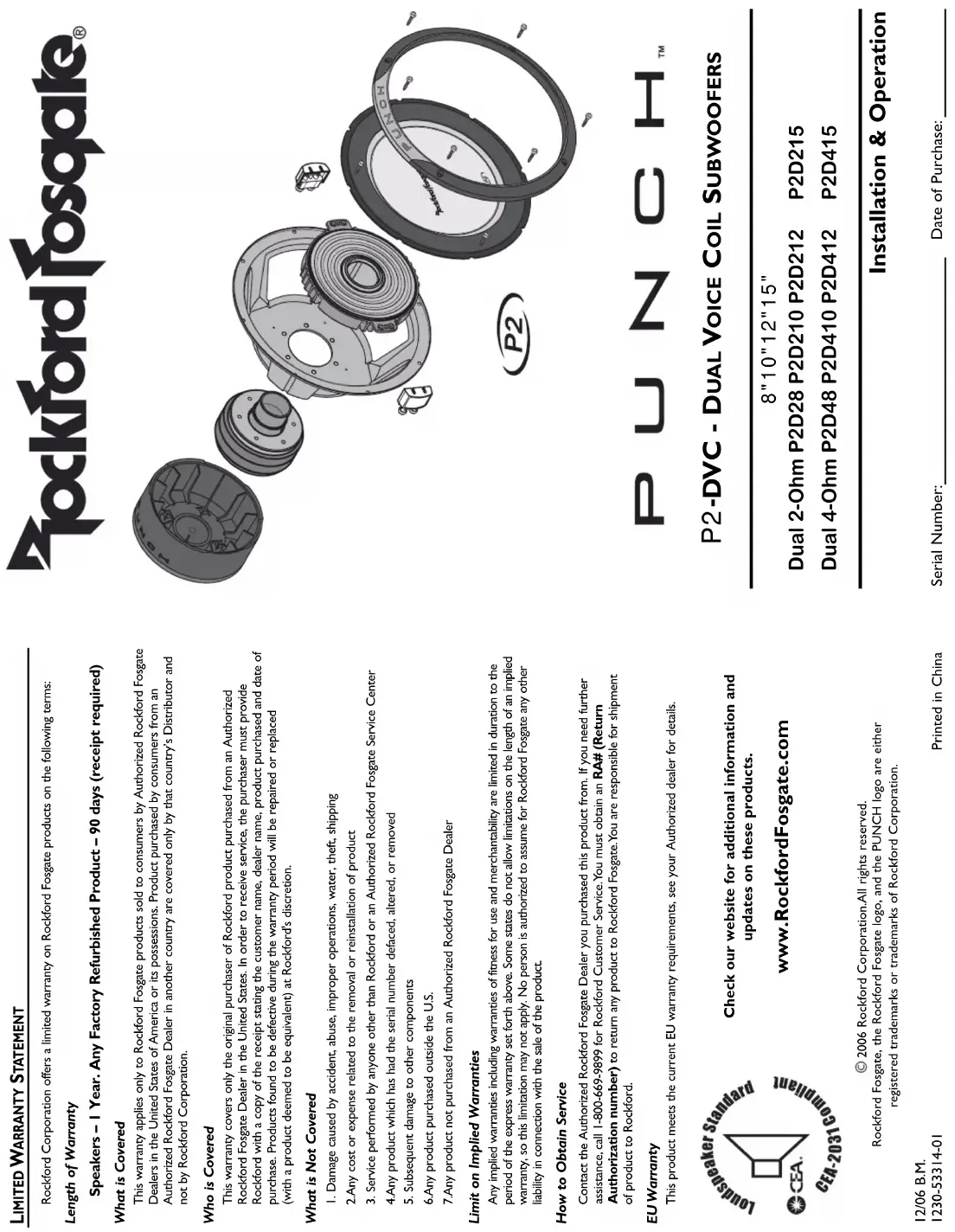 Serial Number: Date of Purchase: Rockford Corporation offers a limited warranty on Rockford Fosgate products on the following terms: Length of Warranty Speakers – 1 Year. Any Factory Refurbished Product – 90 days (receipt required) What is Covered This warranty applies only to Rockford Fosgate products sold to consumers by Authorized Rockford FosgateDealers in the United States of America or its possessions. Product purchased by consumers from anAuthorized Rockford Fosgate Dealer in another country are covered only by that country’s Distributor andnot by Rockford Corporation. Who is Covered This warranty covers only the original purchaser of Rockford product purchased from an AuthorizedRockford Fosgate Dealer in the United States. In order to receive service, the purchaser must provideRockford with a copy of the receipt stating the customer name, dealer name, product purchased and date ofpurchase. Products found to be defective during the warranty period will be repaired or replaced (with a product deemed to be equivalent) at Rockford's discretion. What is Not Covered 1. Damage caused by accident, abuse, improper operations, water, theft, shipping2.Any cost or expense related to the removal or reinstallation of product3. Service performed by anyone other than Rockford or an Authorized Rockford Fosgate Service Center4.Any product which has had the serial number defaced, altered, or removed5. Subsequent damage to other components6.Any product purchased outside the U.S.7.Any product not purchased from an Authorized Rockford Fosgate Dealer Limit on Implied Warranties Any implied warranties including warranties of fitness for use and merchantability are limited in duration to theperiod of the express warranty set forth above. Some states do not allow limitations on the length of an impliedwarranty, so this limitation may not apply. No person is authorized to assume for Rockford Fosgate any other liability in connection with the sale of the product. How to Obtain Service Contact the Authorized Rockford Fosgate Dealer you purchased this product from. If you need further assistance, call 1-800-669-9899 for Rockford Customer Service.You must obtain an RA# (Return Authorization number) to return any product to Rockford Fosgate.You are responsible for shipment of product to Rockford. EU Warranty This product meets the current EU warranty requirements, see your Authorized dealer for details.2006 Rockford Corporation.All rights reserved.Rockford Fosgate, the Rockford Fosgate logo, and the PUNCH logo are either registered trademarks or trademarks of Rockford Corporation.