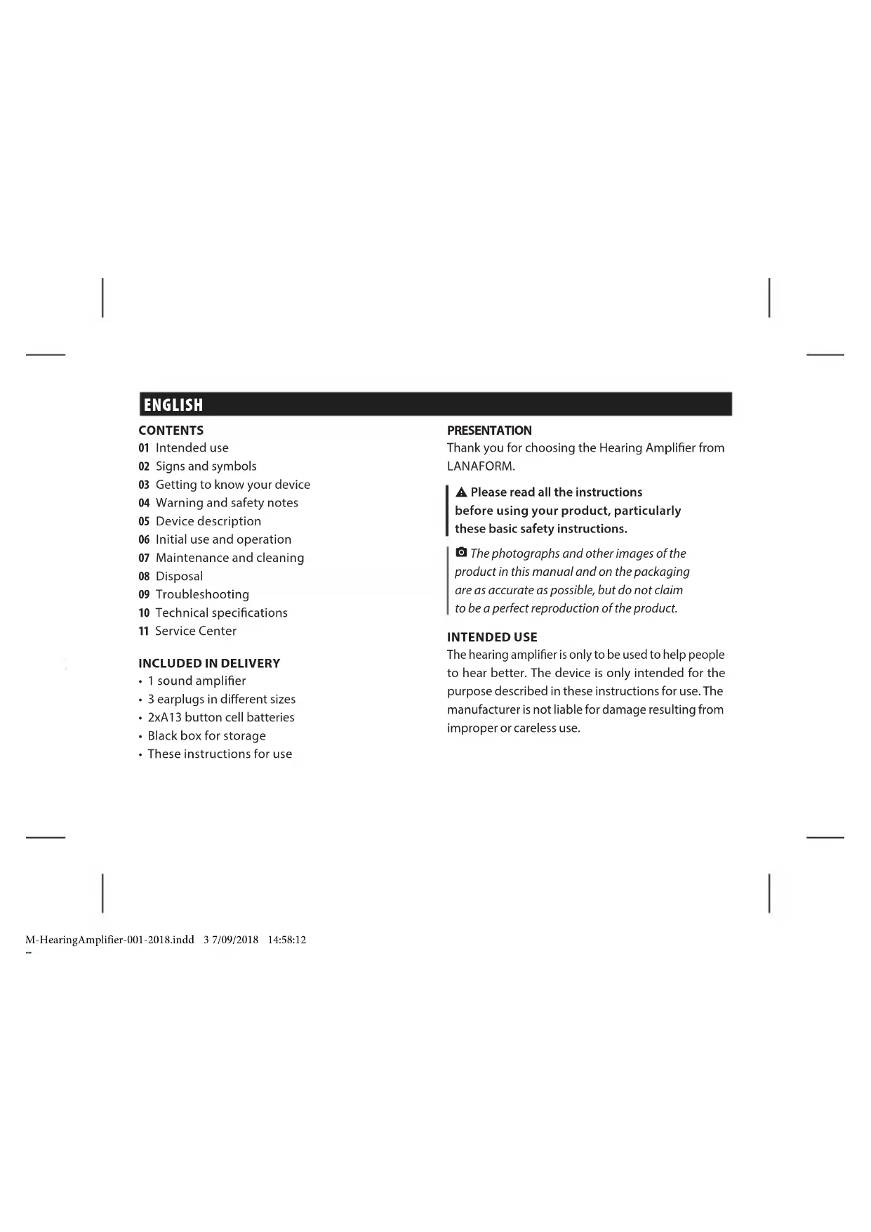 E-IM-HearingAmplifier-001-2018.indd 2 7/09/2018 14:58:12ENGLISH CONTENTS 01 Intended use 02 Signs and symbols 03 Getting to know your device 04 Warning and safety notes 05 Device description 06 Initial use and operation 07 Maintenance and cleaning 08 Disposal 09 Troubleshooting 10 Technical specications 11 Service Center