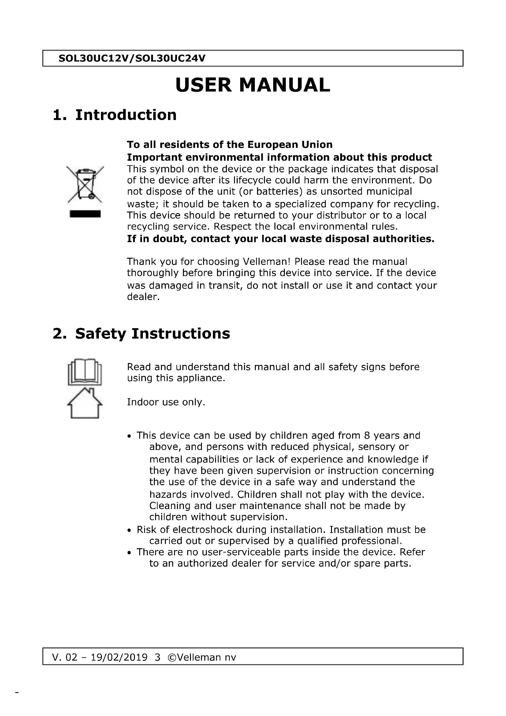 The copyright to this manual is owned by Velleman nv. All worldwide rights reserved. No part of this manual may be copied, reproduced, translated or reduced to any electronic medium or otherwise without the prior written consent of the copyright holder.SOL30UC12V/SOL30UC24V