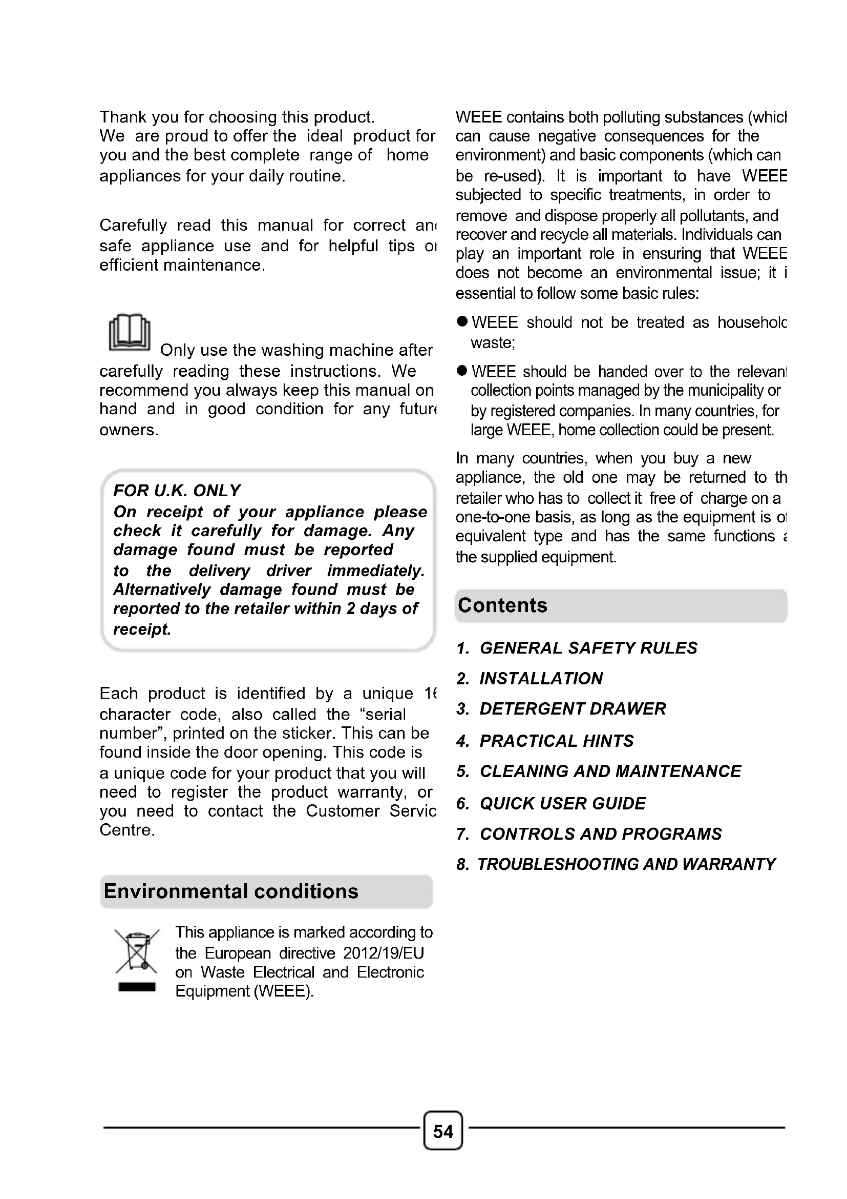 On receipt of your appliance please check it carefully for damage. Any damage found must be reported to the delivery driver immediately. Alternatively damage found must be reported to the retailer within 2 days of receipt. Environmental conditions Contents!