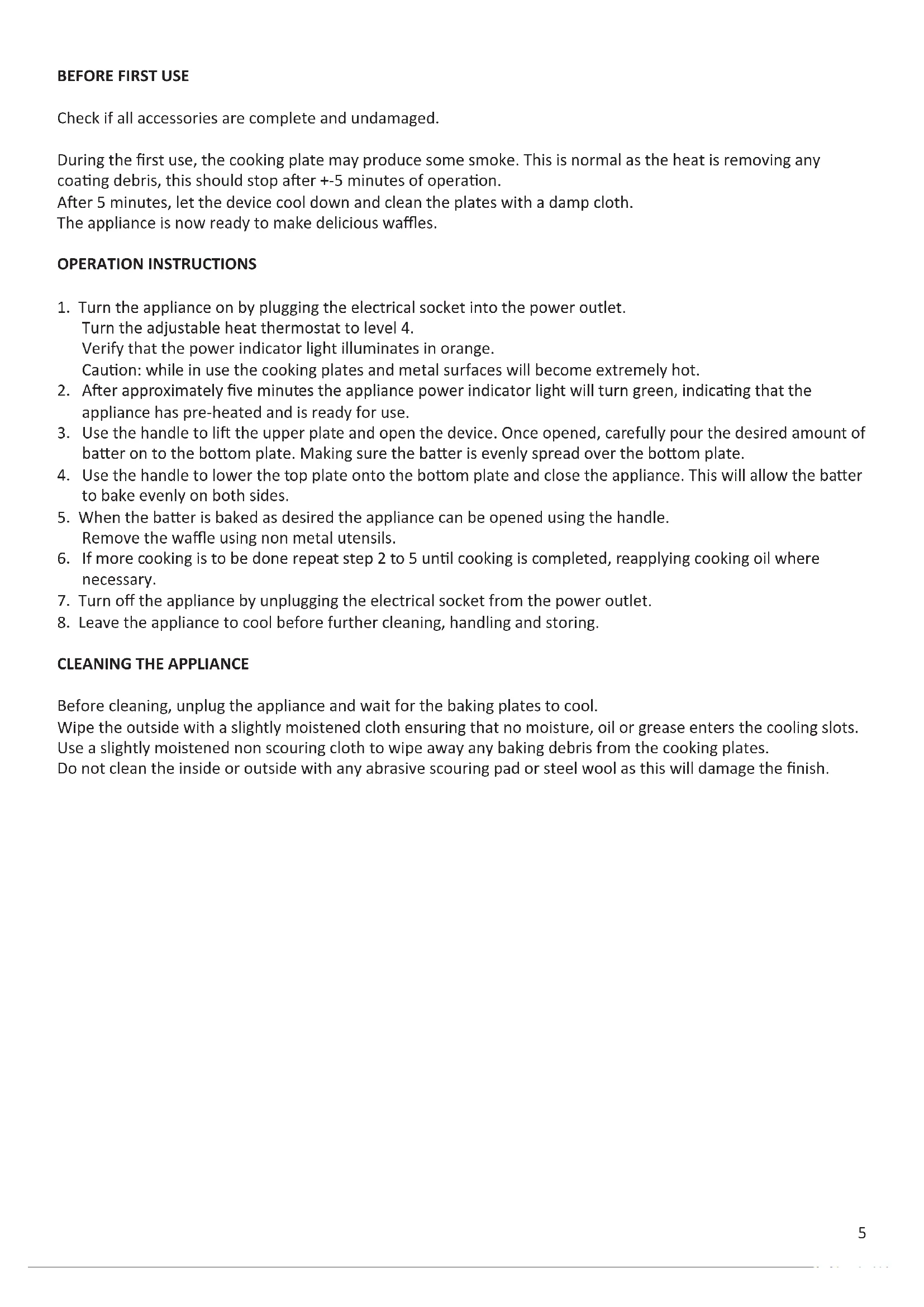 Check if all accessories are complete and undamaged. During the rst use, the cooking plate may produce some smoke. This is normal as the heat is removing any coang debris, this should stop aer +-5 minutes of operaon. Aer 5 minutes, let the device cool down and clean the plates with a damp cloth. The appliance is now ready to make delicious waes. OPERATION INSTRUCTIONS