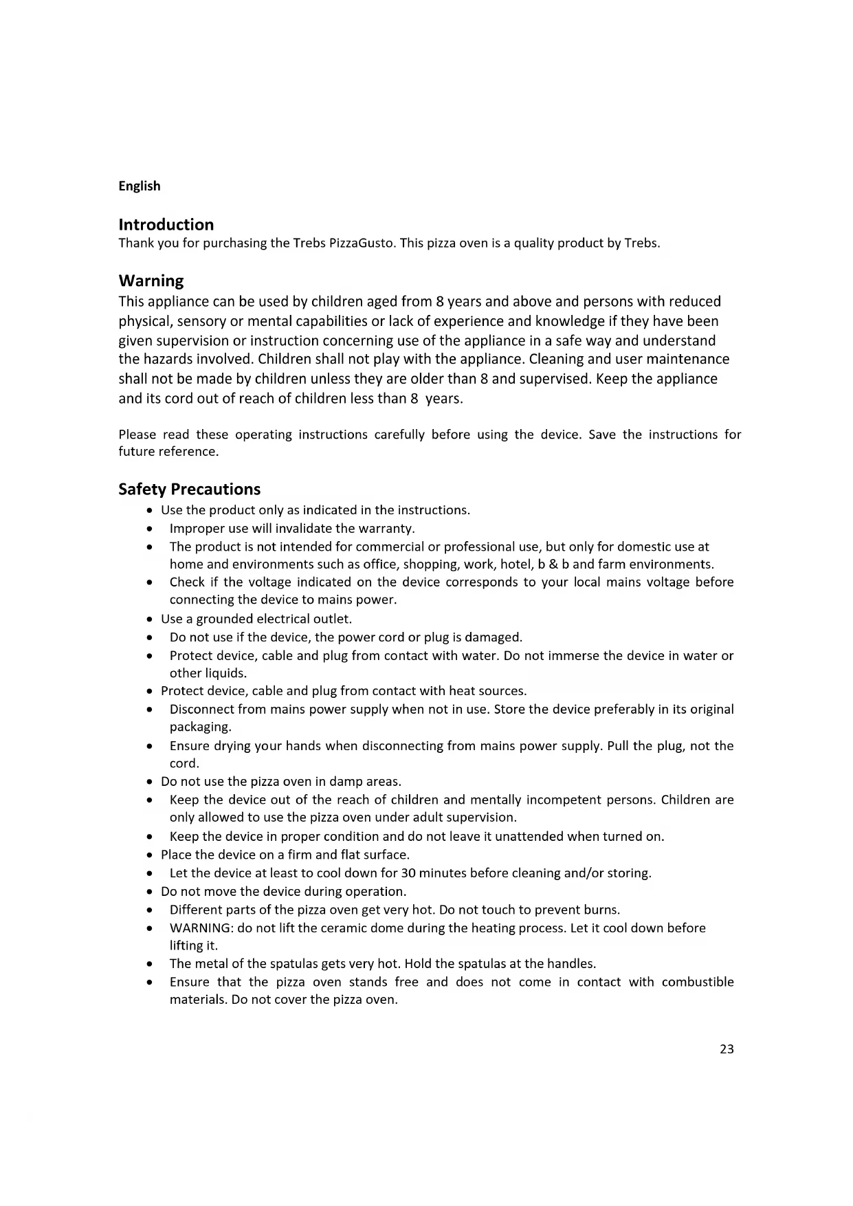 - Ensure that your old device is stored safely away from children until it is taken away. Technical Specifications26 Labeling: Trebs PizzaGusto Article number: 99391 Voltage: 220V-240V〜; 50-60Hz Power: 910W Warranty You have to be registered for warranty with your supplier. This warranty is subject to the following provisions: