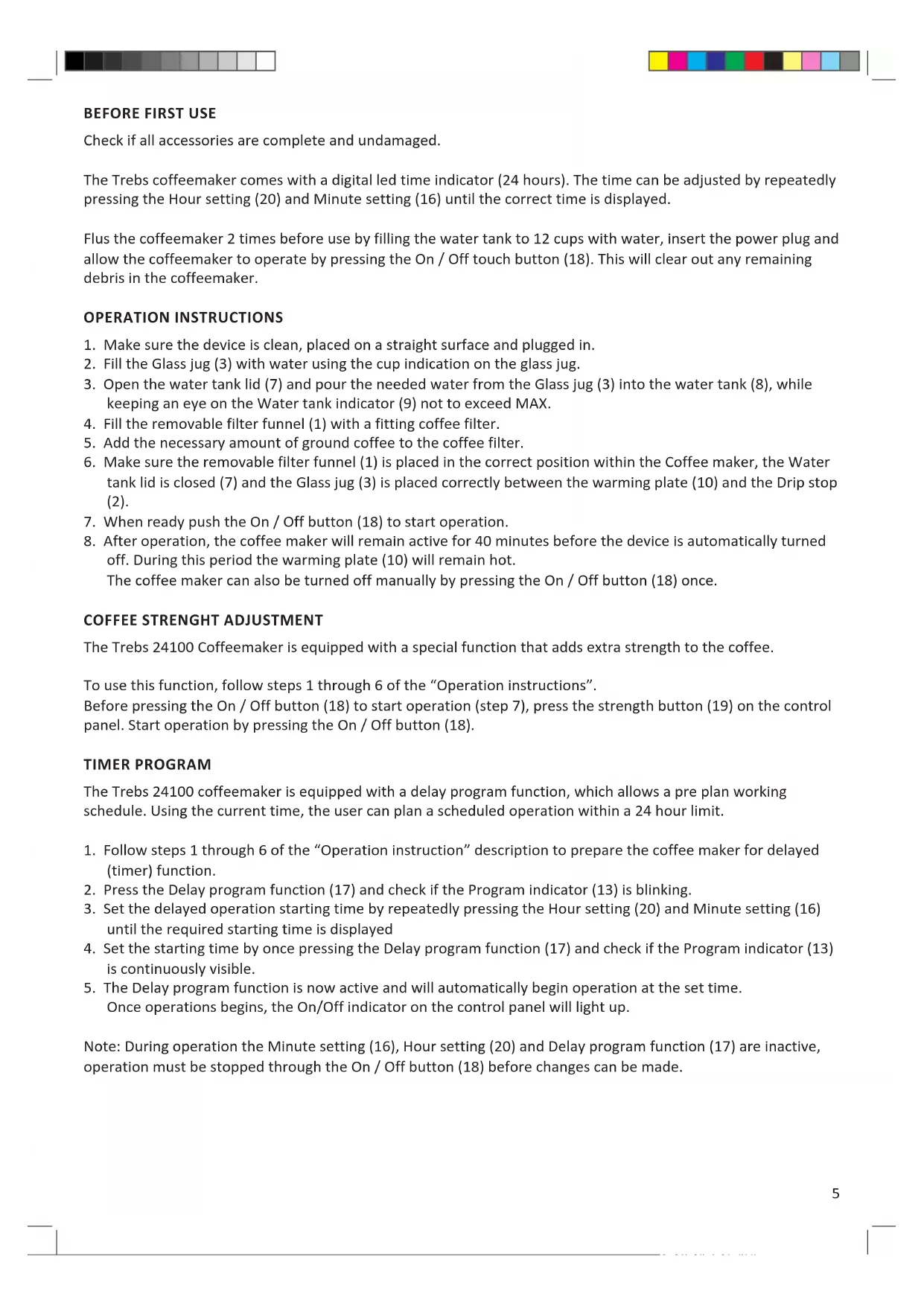 The Trebs 24100 Coffeemaker is equipped with a special function that adds extra strength to the coffee. To use this function, follow steps 1 through 6 of the “Operation instructions”. Before pressing the On / Off button (18) to start operation (step 7), press the strength button (19) on the control panel. Start operation by pressing the On / Off button (18). TIMER PROGRAM The Trebs 24100 coffeemaker is equipped with a delay program function, which allows a pre plan working schedule. Using the current time, the user can plan a scheduled operation within a 24 hour limit.