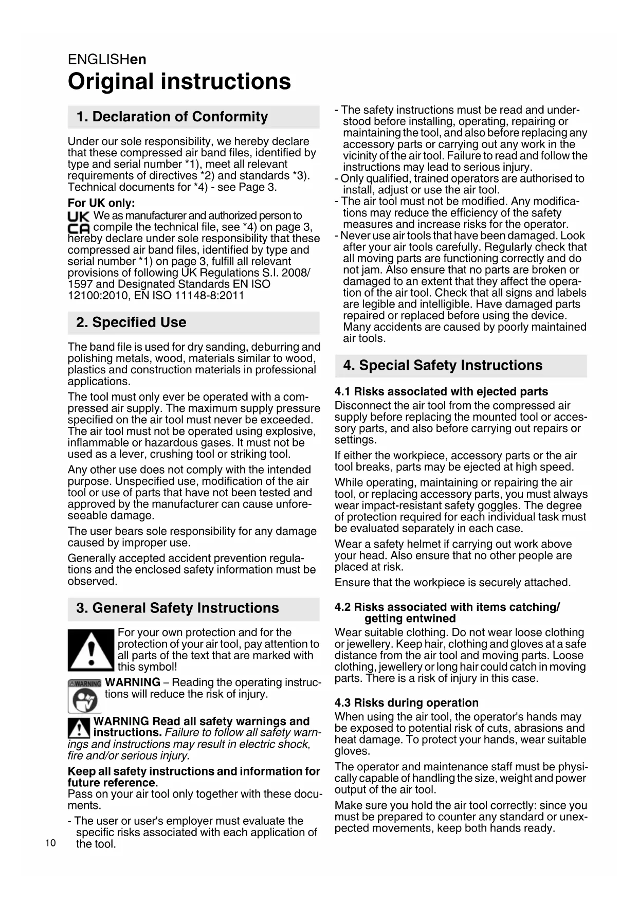 The band file is used for dry sanding, deburring and polishing metals, wood, materials similar to wood, plastics and construction materials in professional applications. The tool must only ever be operated with a com- pressed air supply. The maximum supply pressure specified on the air tool must never be exceeded. The air tool must not be operated using explosive, inflammable or hazardous gases. It must not be used as a lever, crushing tool or striking tool. Any other use does not comply with the intended purpose. Unspecified use, modification of the air tool or use of parts that have not been tested and approved by the manufacturer can cause unfore- seeable damage. The user bears sole responsibility for any damage caused by improper use. Generally accepted accident prevention regula- tions and the enclosed safety information must be observed. For your own protection and for the protection of your air tool, pay attention to all parts of the text that are marked with this symbol! WARNING – Reading the operating instruc- tions will reduce the risk of injury. WARNING Read all safety warnings and instructions. Failure to follow all safety warn- ings and instructions may result in electric shock, fire and/or serious injury. Keep all safety instructions and information for future reference. Pass on your air tool only together with these docu- ments. - The user or user's employer must evaluate the specific risks associated with each application of the tool. - The safety instructions must be read and under- stood before installing, operating, repairing or maintaining the tool, and also before replacing any accessory parts or carrying out any work in the vicinity of the air tool. Failure to read and follow the instructions may lead to serious injury. - Only qualified, trained operators are authorised to install, adjust or use the air tool. - The air tool must not be modified. Any modifica- tions may reduce the efficiency of the safety measures and increase risks for the operator. - Never use air tools that have been damaged. Look after your air tools carefully. Regularly check that all moving parts are functioning correctly and do not jam. Also ensure that no parts are broken or damaged to an extent that they affect the opera- tion of the air tool. Check that all signs and labels are legible and intelligible. Have damaged parts repaired or replaced before using the device. Many accidents are caused by poorly maintained air tools.
