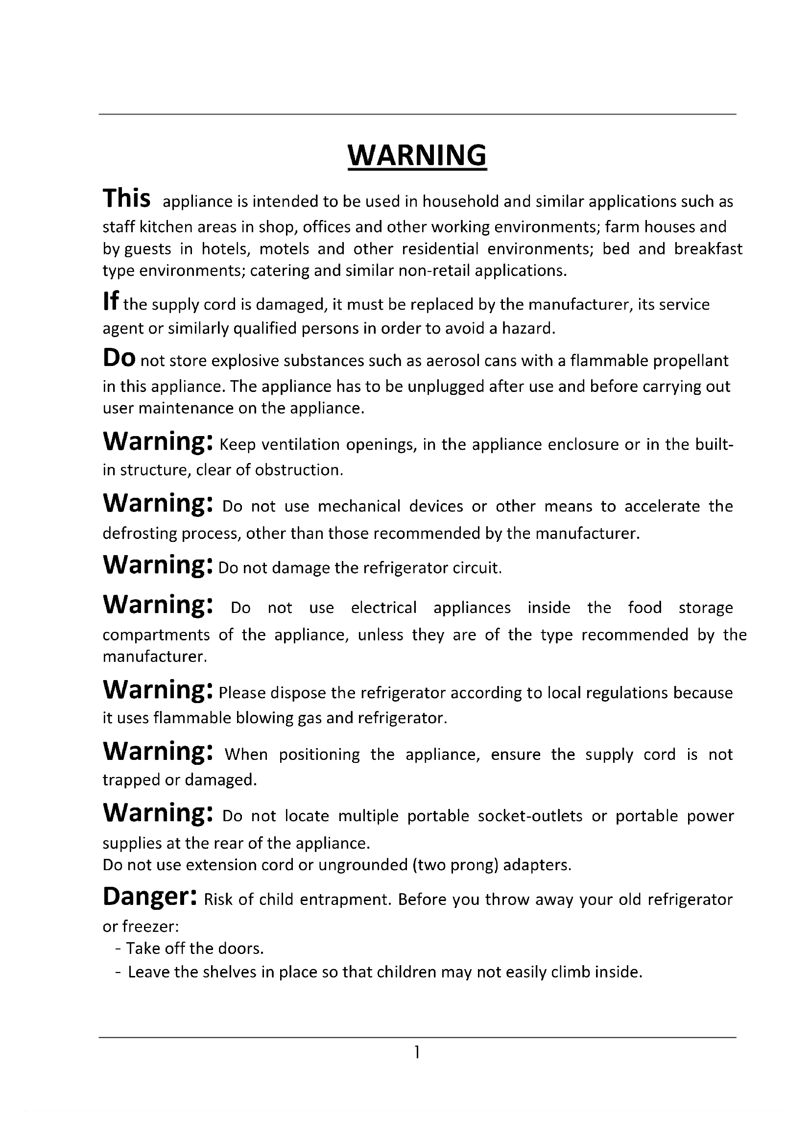 WARNING This appliance is intended to be used in household and similar applications such as staff kitchen areas in shop, offices and other working environments; farm houses and by guests in hotels, motels and other residential environments; bed and breakfast type environments; catering and similar non-retail applications. If the supply cord is damaged, it must be replaced by the manufacturer, its service agent or similarly qualified persons in order to avoid a hazard. Do not store explosive substances such as aerosol cans with a flammable propellant in this appliance. The appliance has to be unplugged after use and before carrying out user maintenance on the appliance.