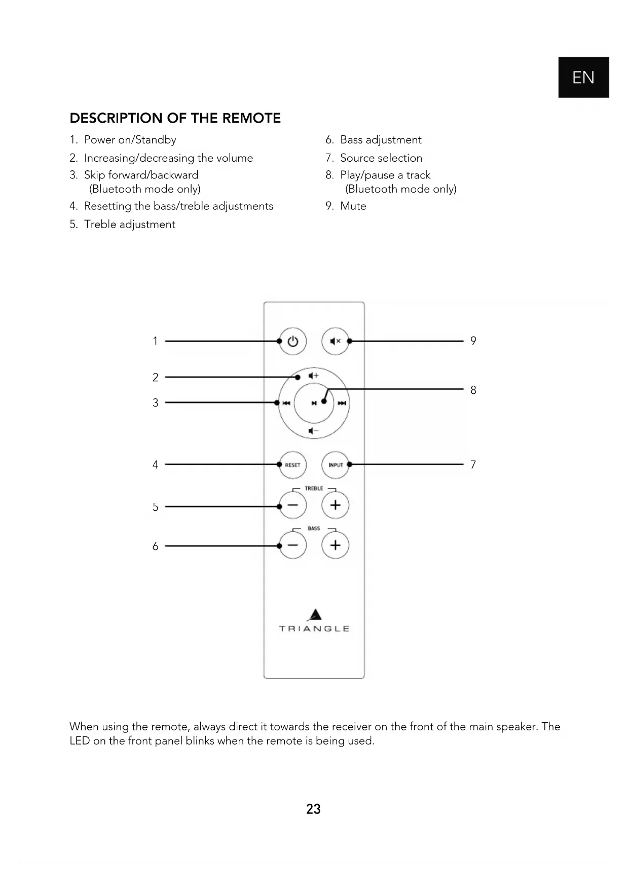 When using the remote, always direct it towards the receiver on the front of the main speaker. The LED on the front panel blinks when the remote is being used.24