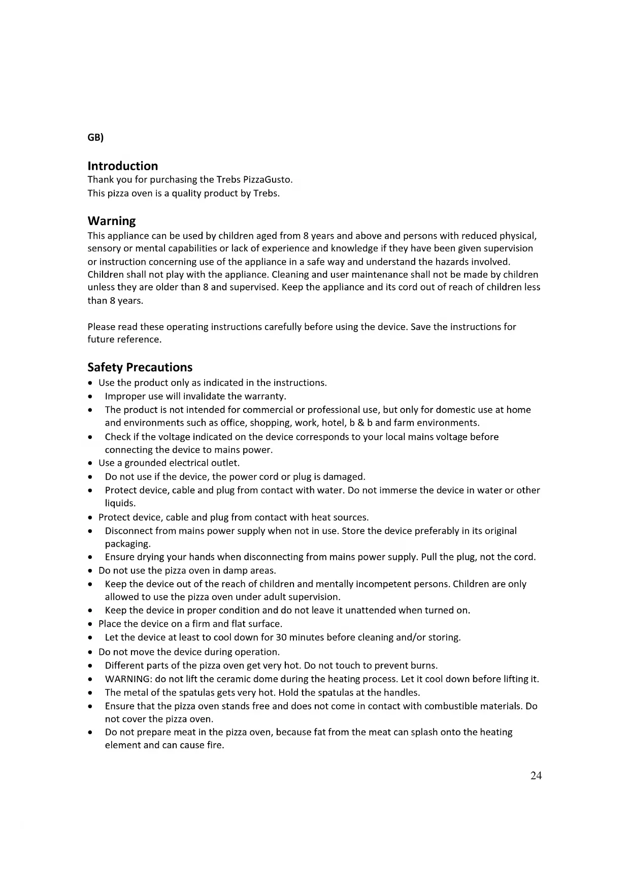 Service If you have any further questions about the product after reading this manual, please contact the Trebs customer service. Trebs BV Thermiekstraat 1a 6361 HB Nuth Nederland Internet: www.trebs.nl / www.trebsshop.com28 Recipes Pizza Dough 500 g flour Knife point of salt 4 tablespoons olive oil 20 g fresh yeast or 1 packet dry yeast 250 ml lukewarm water Recipe with fresh yeast: - Take a bowl and mix the flour with the olive oil and salt. - Dissolve the fresh yeast in lukewarm water and stir into a smooth substance. - Mix the lump-free yeast with the flower. Recipe with dry yeast: - Take a bowl and mix the flour, olive oil, salt, dried yeast and lukewarm water. - Knead into a smooth dough. Optionally use a blender or food processor. - Cover the bowl with a cloth and let it rise for 45 minutes until the volume is doubled. - Sprinkle the dough with flour and roll it out to a thickness of 3 mm. Turn the dough occasionally and sprinkle with flour to prevent it to stick. - Use the round dough form to cut out the pizza bases. Tomato Sauce 1 tin peeled tomatoes 1 small tin tomato paste Pepper & salt Oregano 2 tablespoons olive oil 2 cloves of garlic - Finely chop the peeled tomatoes. - Mix all ingredients into a sauce. Topping Recommendation Cheeses: mozzarella, grated Parmesan cheese, grated Gouda cheese, etc. Seafood: smoked salmon, prawns, canned tuna, etc. Vegetables: green peppers, rocket, olives, mushrooms, spinach, onion, etc. Herbs: Basil, pepper, salt, Italian spices, etc. Meat: ham, bacon, salami, etc. Place the toppings for the pizzas in cups on the table. - Grease the spatulas with a little oil and place them on your plate. - Place one pizza base on the spatula. - Give some tomato sauce on the pizza base. Leave about half an inch dough at the edge. - Top the pizza with ingredients to your own taste.29 Variations: - Use ready-made pizza bases from the supermarket - Use ready-made pizzas from the supermarket - It is also possible to naan bread to bake in the dome of the pizza oven30