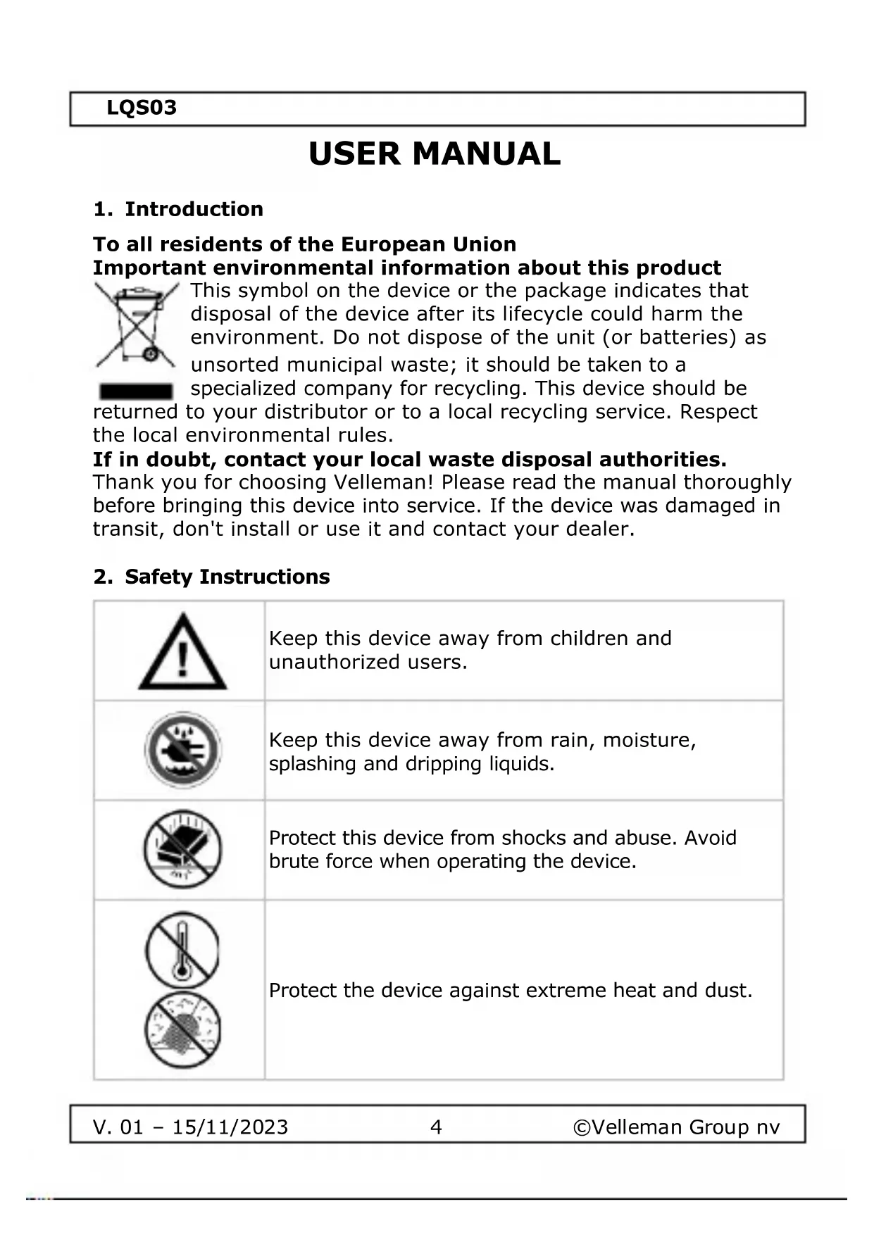 Use this device with original accessories only. Velleman Group nv cannot be held responsible in the event of damage or injury resulting from (incorrect) use of this device. For more info concerning this product and the latest version of this manual, please visit our website www.velleman.eu. The information in this manual is subject to change without prior notice.LQS03