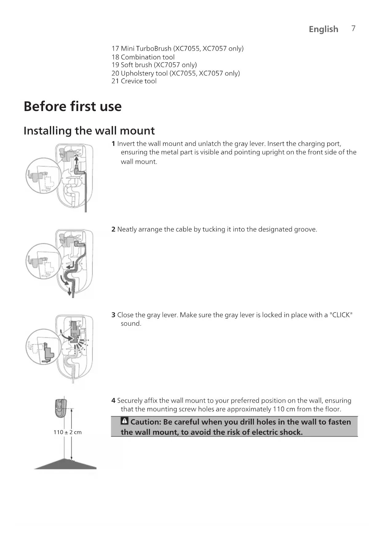 English Contents Introduction _______________________________________________________________________________ 6 General description_________________________________________________________________________ 6 Before first use_____________________________________________________________________________ 7 Installing the wall mount ____________________________________________________________________ 7 Preparing for use___________________________________________________________________________ 8 Using the appliance ________________________________________________________________________ 9 Assembling the appliance ___________________________________________________________________ 9 Vacuuming soft and hard floors ______________________________________________________________ 10 Vacuuming while mopping hard floors________________________________________________________ 11 Versatile usage and accessories ______________________________________________________________ 14 Customizations and additional information____________________________________________________ 17 After use – Maintenance ____________________________________________________________________ 19 Frequent maintenance after each cleaning cycle _______________________________________________ 19 Periodic maintenance intermittently __________________________________________________________ 22 Replacement ______________________________________________________________________________ 28 User interface signals and their meaning ______________________________________________________ 29 Troubleshooting ___________________________________________________________________________ 31 Dry cleaning _______________________________________________________________________________ 31 Wet cleaning ______________________________________________________________________________ 35 Introduction Thank you for buying this product! To fully benefit from the support that we offer, register your product at www.philips.com/mycordlessvacuum-7000s. General description 1 Digital display a Ring indicator of battery level b Percentage of battery level c Selected power level d Floor Type Recognition feature activation icon e Filter cleaning reminder icon 2 Menu/Confirm button 3 + Button 4 – Button 5 On/off button 6 Handheld 7 Dust bucket 8 Battery 9 Extra filter (XC7057 only) 10 Dust bucket release button 11 Wallmount 12 Adapter 13 Tube 14 PrecisionPower Smart Nozzle 15 Aqua tank 16 Microfiber mopping pad7 English 17 Mini TurboBrush (XC7055, XC7057 only) 18 Combination tool 19 Soft brush (XC7057 only) 20 Upholstery tool (XC7055, XC7057 only) 21 Crevice tool Before first use Installing the wall mount 1 Invert the wall mount and unlatch the gray lever. Insert the charging port, ensuring the metal part is visible and pointing upright on the front side of the wall mount. 2 Neatly arrange the cable by tucking it into the designated groove. 3 Close the gray lever. Make sure the gray lever is locked in place with a "CLICK" sound. 110 ± 2 cm 4 Securely affix the wall mount to your preferred position on the wall, ensuring that the mounting screw holes are approximately 110 cm from the floor. Caution: Be careful when you drill holes in the wall to fasten the wall mount, to avoid the risk of electric shock.8 English Note: Verify that the placement of the wall mount allows the entire appliance to hang on the wall without the nozzle coming into contact with the floor. 5 Once you have determined the optimal position and height for storing and charging your appliance, firmly tighten the screws to secure the wall mount in place. Preparing for use The appliance is equipped with a Li-Ion battery. Charging from empty to full takes about 6 hours. 1 Attach the battery pack to the main body of the appliance, ensuring a secure connection that's confirmed with a "CLICK" sound. MAX 40⁰C MIN 5⁰C 2 Charge your appliance by placing it onto the assembled wall mount.