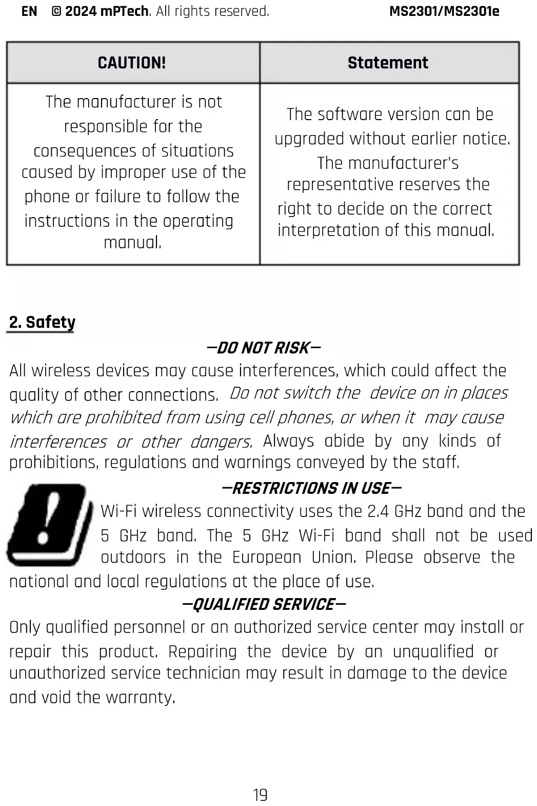 Wi-Fi wireless connectivity uses the 2.4 GHz band and the 5 GHz band. The 5 GHz Wi-Fi band shall not be used outdoors in the European Union. Please observe the national and local regulations at the place of use. —QUALIFIED SERVICE— Only qualified personnel or an authorized service center may install or repair this product. Repairing the device by an unqualified or unauthorized service technician may result in damage to the device and void the warranty.EN © 2024 mPTech. All rights reserved. MS2301/MS2301e