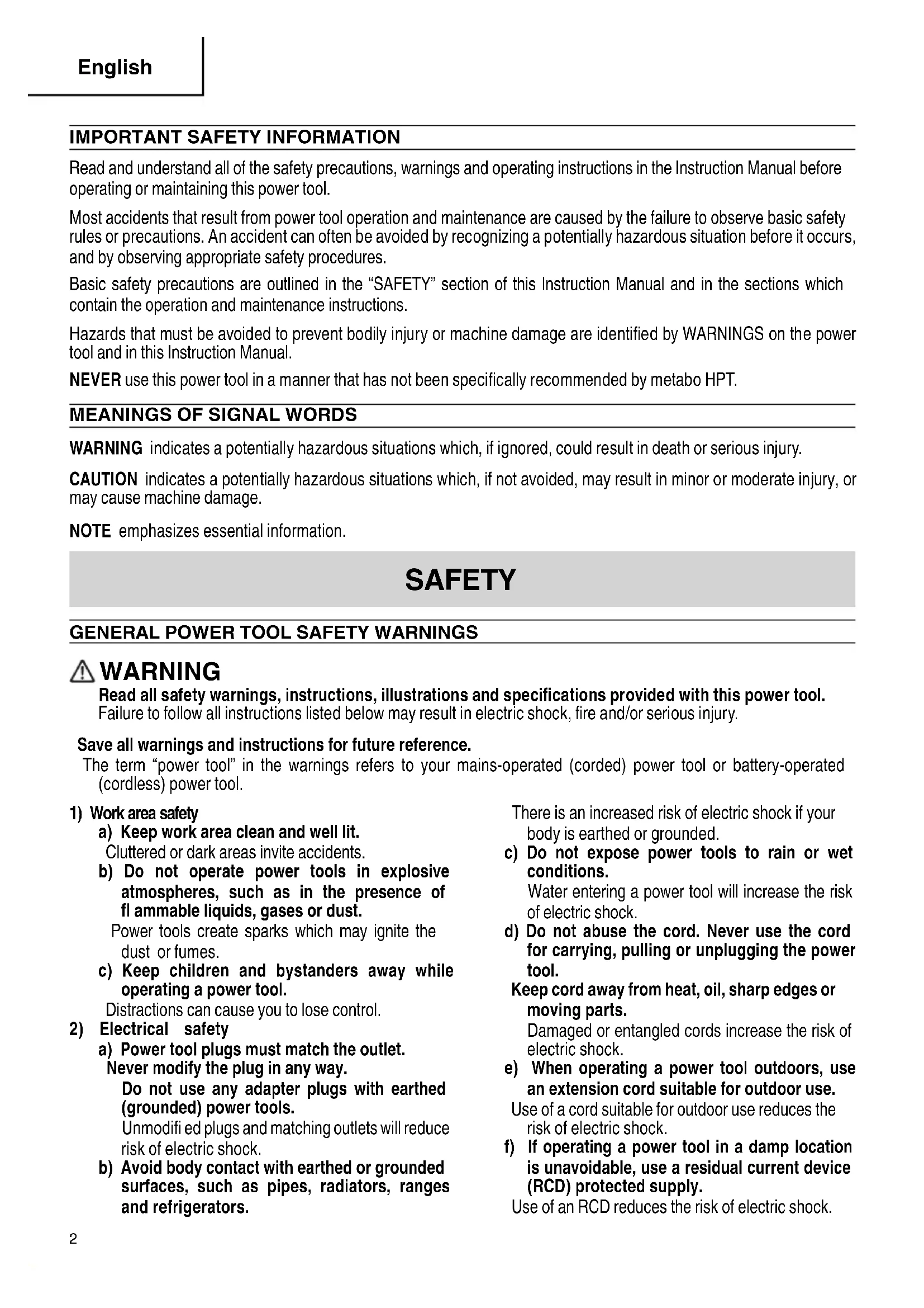 All quality power tools will eventually require servicing or replacement of parts because of wear from normal use. To assure that only authorized replacement parts will be used, all service and repairs must be performed by a metabo HPT AUTHORIZED SERVICE CENTER, ONLY. CAUTION In the operation and maintenance of power tools, the safety regulations and standards prescribed in each country must be observed. Important notice on the batteries for the metabo HPT cordless power tools Please always use one of our designated genuine batteries. We cannot guarantee the safety and performance of our cordless power tool when used with batteries other than these designated by us, or when the battery is disassembled and modifi ed (such as disassembly and replacement of cells or other internal parts).