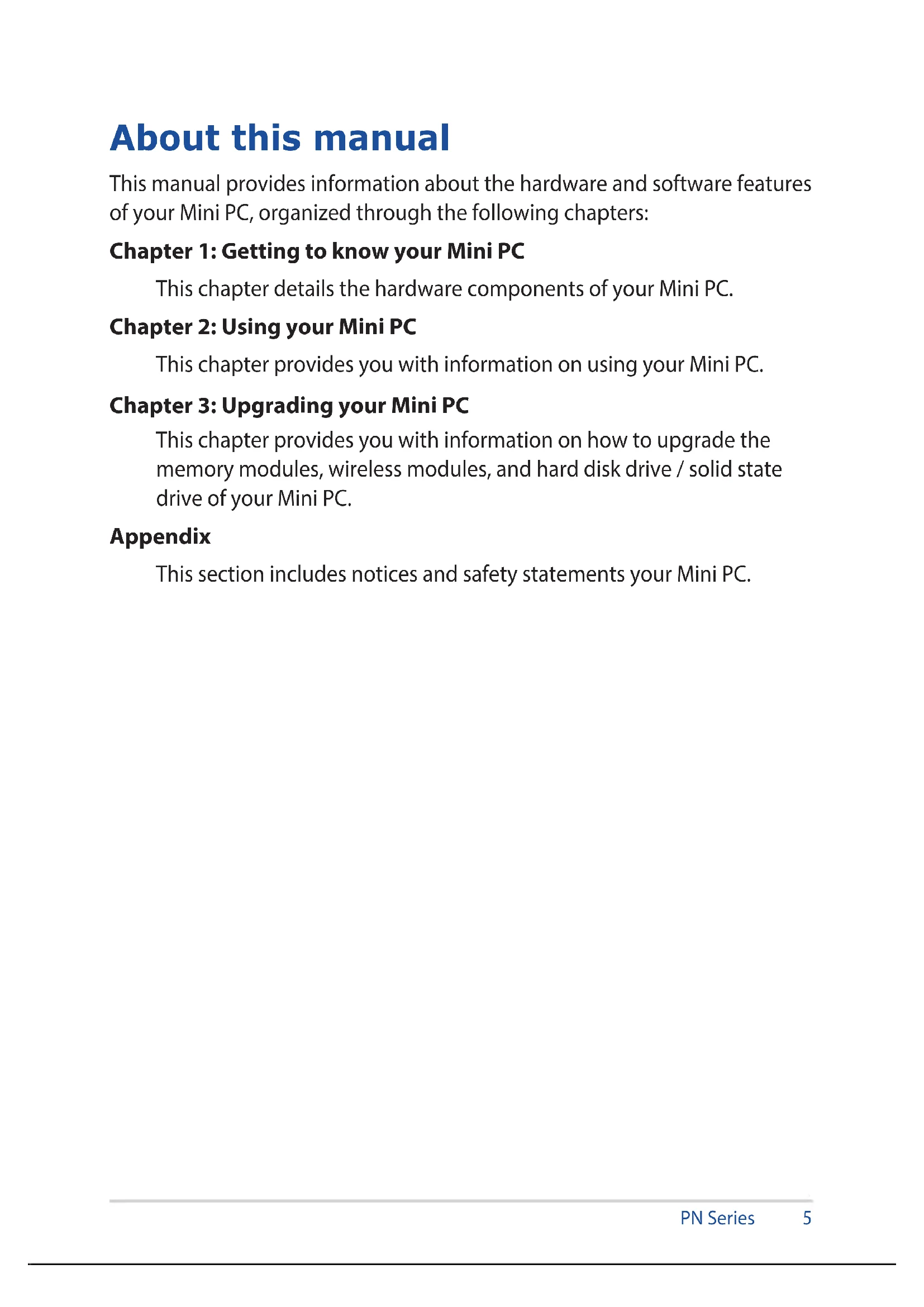 About this manual This manual provides information about the hardware and software features of your Mini PC, organized through the following chapters: