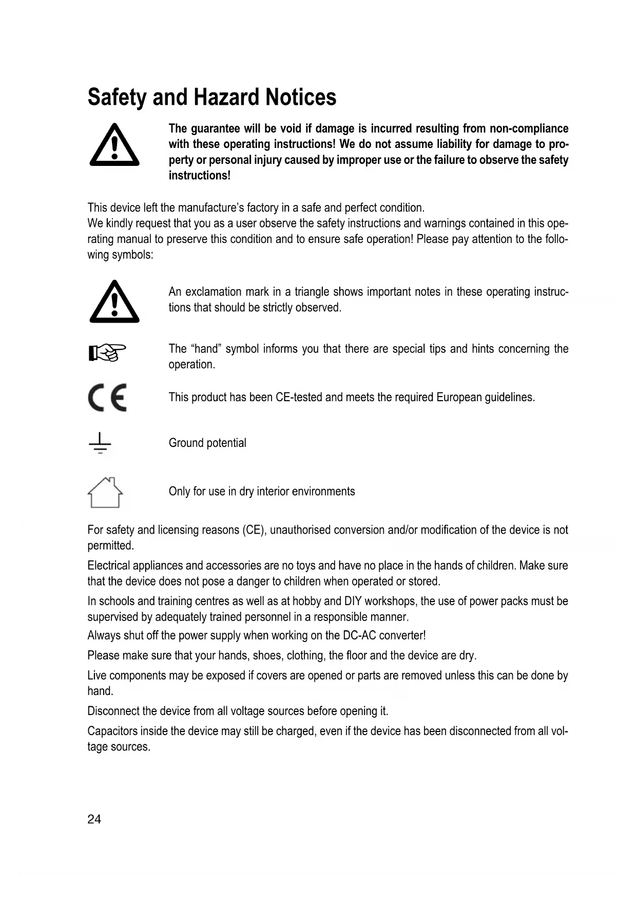The “hand” symbol informs you that there are special tips and hints concerning the operation. This product has been CE-tested and meets the required European guidelines. Ground potential Only for use in dry interior environments For safety and licensing reasons (CE), unauthorised conversion and/or modification of the device is not permitted. Electrical appliances and accessories are no toys and have no place in the hands of children. Make sure that the device does not pose a danger to children when operated or stored. In schools and training centres as well as at hobby and DIY workshops, the use of power packs must be supervised by adequately trained personnel in a responsible manner. Always shut off the power supply when working on the DC-AC converter! Please make sure that your hands, shoes, clothing, the floor and the device are dry. Live components may be exposed if covers are opened or parts are removed unless this can be done by hand. Disconnect the device from all voltage sources before opening it. Capacitors inside the device may still be charged, even if the device has been disconnected from all vol- tage sources.25 Avoid sudden temperature fluctuations! This may easily lead to condensation inside the device! In this case, the device must be adjusted to the new ambience temperature before start up for at least one hour in a well-ventilated place. The converter heats up in operation; ensure that it is adequately ventilated. Do not cover the ventilation apertures of the device! Do not leave converters and the connected consumers running without supervision. Ensure sufficient ventilation of the DC-AC converter and the batteries. Battery vapours may ignite because of the DC-AC converter Therefore, the battery and the converter must be installed in separate spaces. Do not connect the 230 V output of the DC-AC converter with another 230 V source. The converter is not designed for application to human beings or animals or for life-supporting medical devices. Never expose the device to mechanical stress. Dropping the device even from a low height may damage it! Avoid vibrations and direct sunlight. If you have reason to believe that the device can no longer be operated safely, disconnect it immediately and make sure it is not unintentionally operated. It must be assumed that safe operation is no longer pos- sible if: - the device shows visible damage, - the device no longer works and - the device was stored under unfavourable conditions for a long period of time or - after it was exposed to extraordinary stress caused by transport. Observe also the additional safety instructions in each chapter of these operating instructions as well as in the operating instructions of the connected devices. Observe that parts of the converter will continue to be live after the protective device (fuse) is triggered! Handle the product with care. It can be damaged through impact, blows, or accidental drops, even from a low height. Have the device checked by trained specialists in this case before recommissioning. If you notice any damage, the device must not be used anymore. Take the device to a specialized work- shop or dispose of it in an environmentally friendly way. Damaged connection cables must be exchanged to prevent hazards! Only use suitably sized connection cables (see “Technical Data”). Repairs on this device may only be performed by specialists. Improper repairs may result in substantial hazards! In case of repairs, contact our service department. Never use the device on hot surfaces. Make sure that ventilation slots are not covered up. Protect the converter from heat! If the converter heats up too far due to excessive ambience temperatures, the overheating protection switches off the device to prevent subsequent damage. In this case, wait until the device has cooled off. When using the device in vehicles, secure it properly to ensure correct operation of the vehicle. Prior to activating the device, make sure that the cable and plug are dry. Never operate the device with wet hands. Only operate the device under supervision.26 Only install the device on low or non-flammable surfaces. Only operate fluorescent tubes with the converter if they are equipped with an electronic starter or con- trol unit. Operation with conventional starters may cause considerable damage to the converter. AC outputs of several power sources must not be connected in parallel! No AC generators or mains vol- tage must be connected to the AC output of the converter. This will immediately destroy the converter! Keep the converter and lead batteries away from ignition sources or open fire! There is a danger of explosion! The converter has 230V/AC at the output. Even when switched off, the charged capacitators may still brief- ly carry 230 V/AC at the output. Never open the converter! The inside of the device may be subject to dan- gerous voltages even after disconnection from the battery. Service and repairs therefore have to be perfor- med by authorised specialists.
