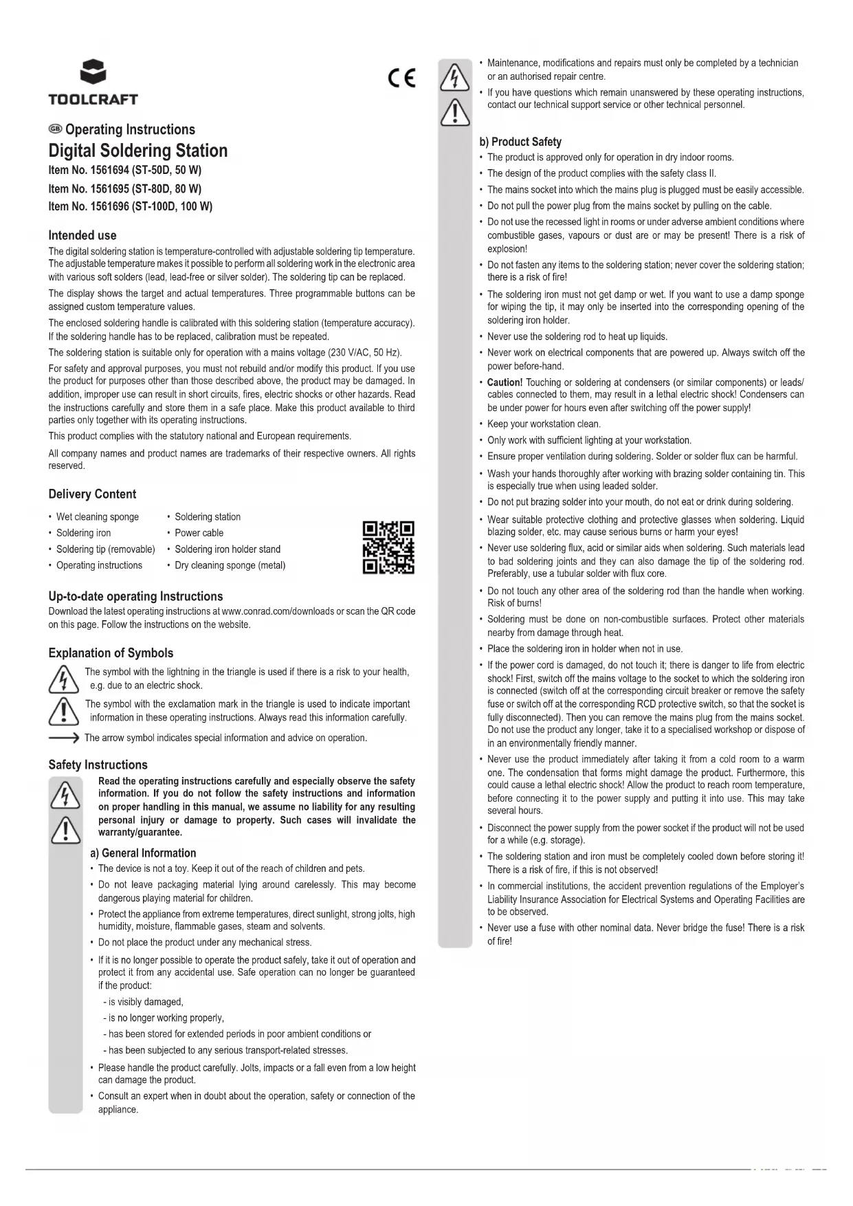 - Never use a fuse with other nominal data. Never bridge the fuse! There is a risk of re! Operating Instructions Digital Soldering Station Item No. 1561694 (ST-50D, 50 W) Item No. 1561695 (ST-80D, 80 W) Item No. 1561696 (ST-100D, 100 W) Intended use The digital soldering station is temperature-controlled with adjustable soldering tip temperature. The adjustable temperature makes it possible to perform all soldering work in the electronic area with various soft solders (lead, lead-free or silver solder). The soldering tip can be replaced. The display shows the target and actual temperatures. Three programmable buttons can be assigned custom temperature values. The enclosed soldering handle is calibrated with this soldering station (temperature accuracy). If the soldering handle has to be replaced, calibration must be repeated. The soldering station is suitable only for operation with a mains voltage (230 V/AC, 50 Hz). For safety and approval purposes, you must not rebuild and/or modify this product. If you use the product for purposes other than those described above, the product may be damaged. In addition, improper use can result in short circuits, res, electric shocks or other hazards. Read the instructions carefully and store them in a safe place. Make this product available to third parties only together with its operating instructions. This product complies with the statutory national and European requirements. All company names and product names are trademarks of their respective owners. All rights reserved. Delivery Content