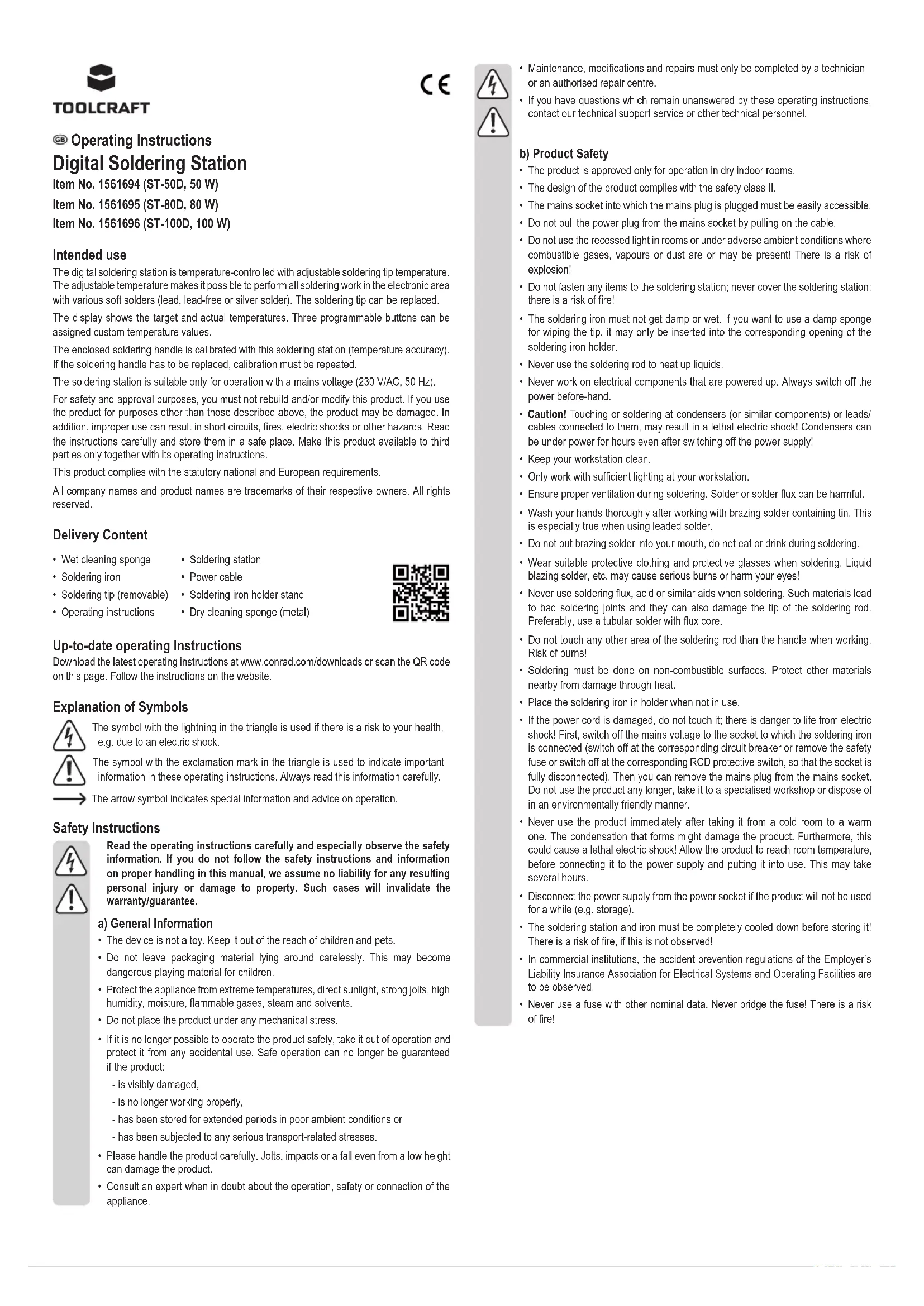 - Dry cleaning sponge (metal) Up-to-date operating Instructions Download the latest operating instructions at www.conrad.com/downloads or scan the QR code on this page. Follow the instructions on the website. Explanation of Symbols The symbol with the lightning in the triangle is used if there is a risk to your health, e.g. due to an electric shock. The symbol with the exclamation mark in the triangle is used to indicate important information in these operating instructions. Always read this information carefully. The arrow symbol indicates special information and advice on operation. Safety Instructions Read the operating instructions carefully and especially observe the safety information. If you do not follow the safety instructions and information on proper handling in this manual, we assume no liability for any resulting personal injury or damage to property. Such cases will invalidate the warranty/guarantee. a) General Information