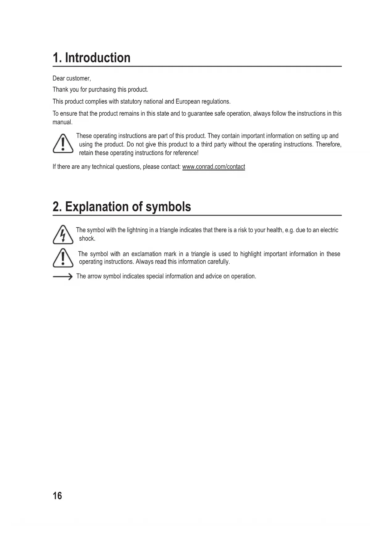 Dear customer, Thank you for purchasing this product. This product complies with statutory national and European regulations. To ensure that the product remains in this state and to guarantee safe operation, always follow the instructions in this manual. These operating instructions are part of this product. They contain important information on setting up and using the product. Do not give this product to a third party without the operating instructions. Therefore, retain these operating instructions for reference! If there are any technical questions, please contact: www.conrad.com/contact