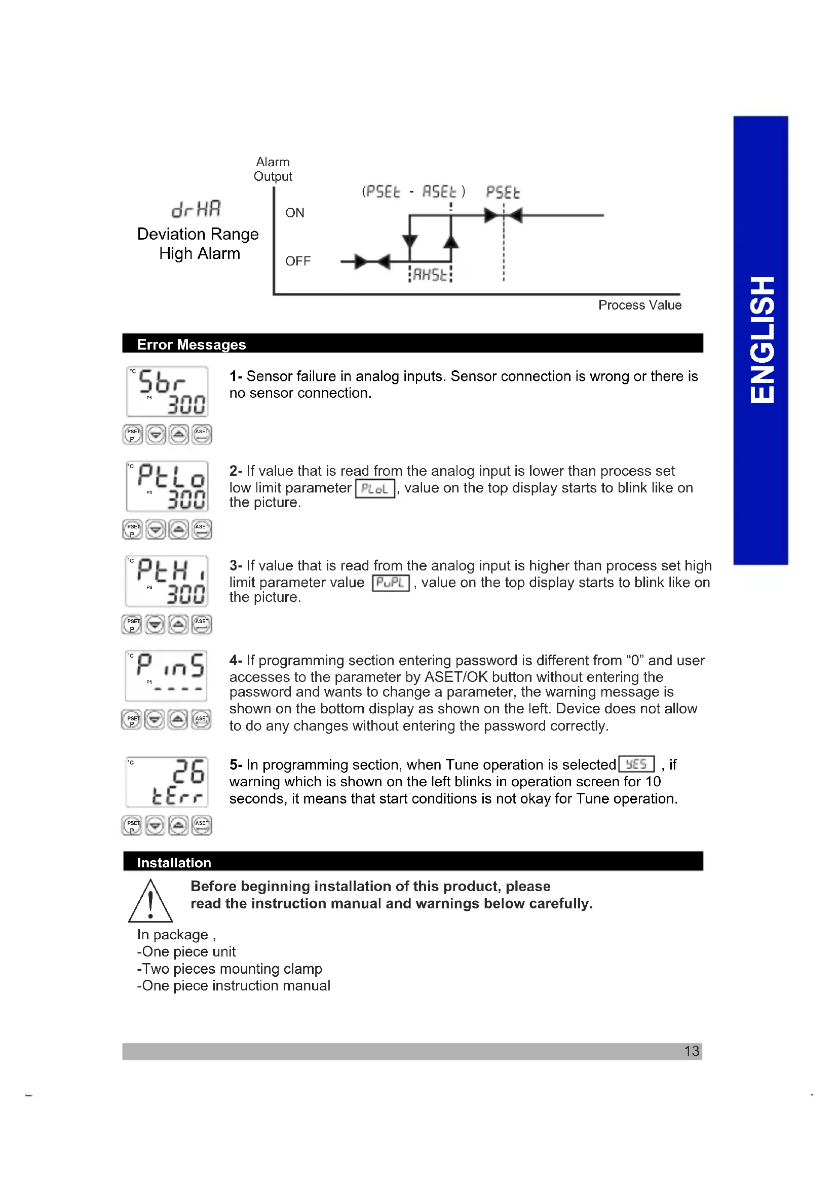 Alarm Set High Limit. (Default: 0) Alarm Set Low Limit parameter. It can be adjusted from Operation Scale minimum to : Alarm Menu Parameters : Process Set value Low Limit. Minimum set value is defined with this parameter. It changes according to the process input type and scale. (Default: -200) : Process Set value High Limit. Maximum set value is defined with this parameter. It changes according to the process input type and scale. (Default: 900) : Display offset for process value. It can be adjusted from -10% of scale to 10% of scale. It is added to the process display value. (Default: 0) : This parameter determines, which output will be Process control output. If rLY is chosen, process output is relay output, if SSr is chosen, process output is SSR output. (Default: Ssr)ENGLISH : Protection Menu Parameter : Alarm Type selection. (Default: ) : Alarm Set High Limit parameter. It can be adjusted from Alarm Set Low Limit to