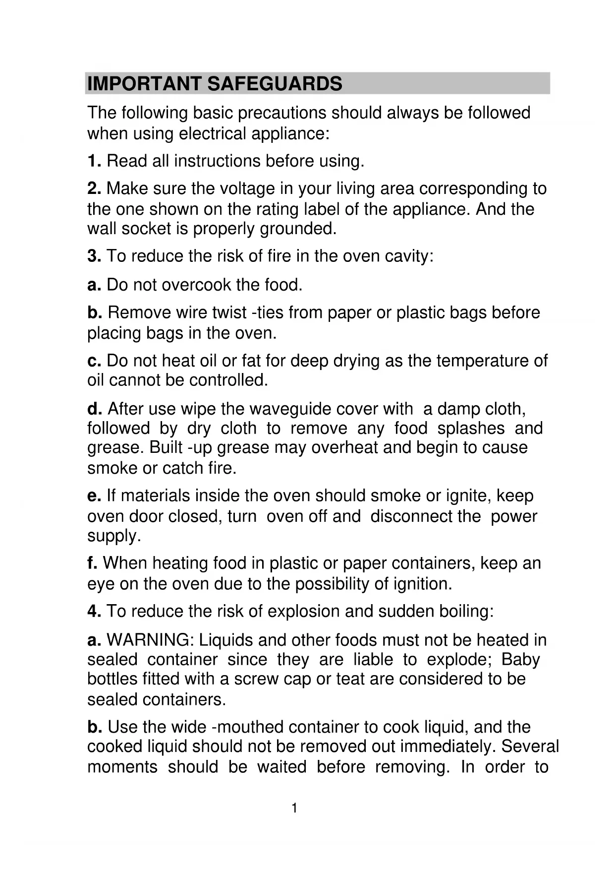 a. WARNING: Liquids and other foods must not be heated in sealed container since they are liable to explode; Baby bottles fitted with a screw cap or teat are considered to be sealed containers. b. Use the wide -mouthed container to cook liquid, and the cooked liquid should not be removed out immediately. Several moments should be waited before removing. In order to2 avoid possible hazards caused by delayed eruptive boiling of liquids. c. Potatoes, sausage and chestnut should be peeled or pierced before cooking. Eggs in their shell, whole hard -boiled eggs should not be heated in microwave ovens since they may explode, even after microwave heating has ended. d. The contents of feeding bottles and baby food jars are to be stirred or shaken and the temperature is to be checked before consumption, in order to avoid burns.